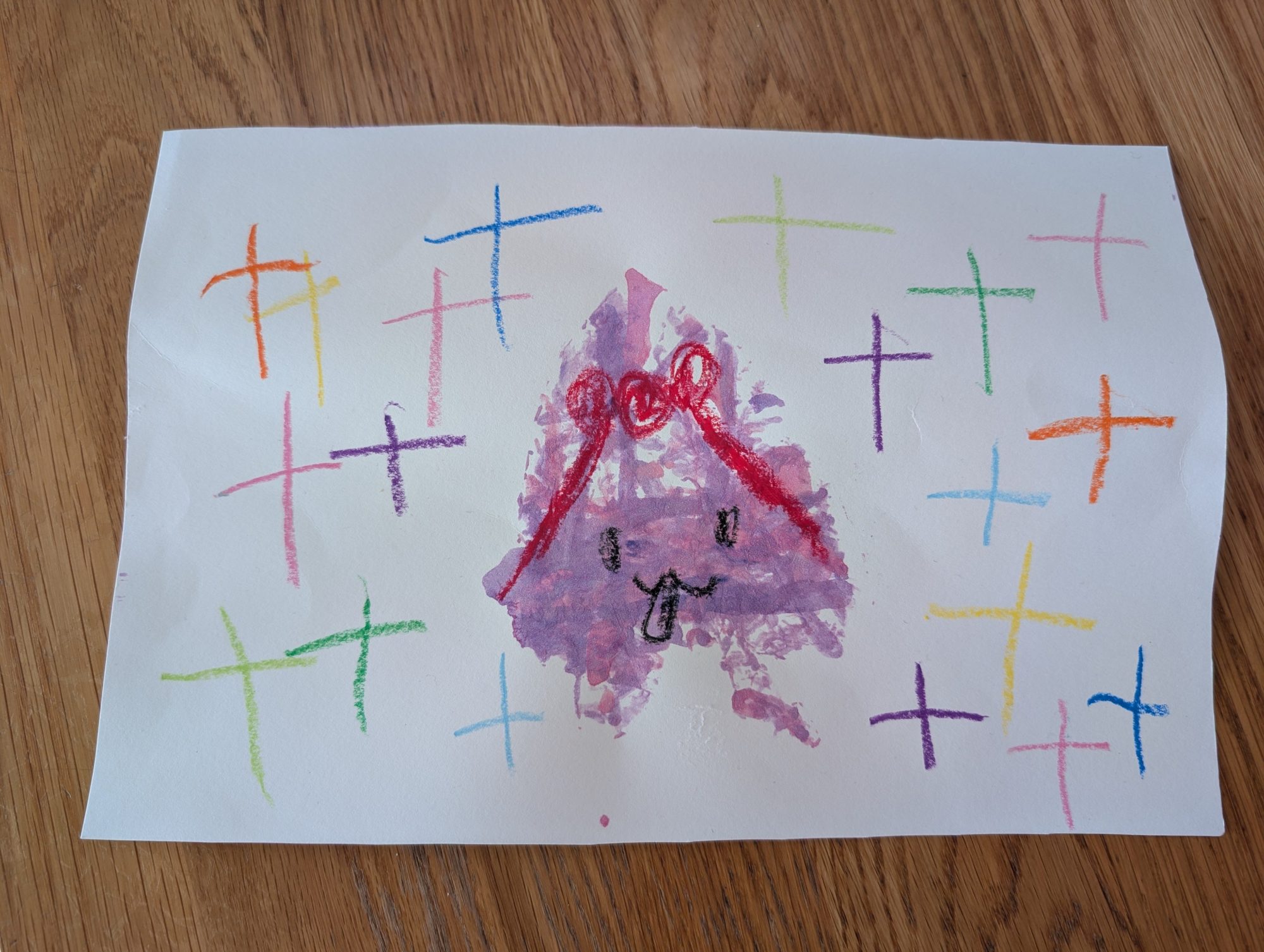 わかめせんせい 先生2026年1月7日 9:27 AM もっちゃん。 画面の真ん中にいる「桃ちゃん」、 にじむ紫とピンクが重なって、 ころころ転がした動きそのものが形になっていますね。 輪郭がきっちりしすぎていないところが、 この技法ならではの“生きた感じ”をつくっています。 まわりに散りばめられたカラフルな「+」の形も、 まるで桃ちゃんのまわりに 楽しさがポンポンはねているみたいです。 主役を囲むリズムとして、とても心地いい配置です。 なかなかうまくいかなくて、 絵の具の薄さを変えたり、紙を変えたりしたこと。 これはもう立派な「研究」です。 うまくいかない=失敗ではなく、 「どうしたらもっと楽しくなるかな?」と 考えて手を動かした時間が、 この絵のいちばん大切なところだと思います。 ころころ転がすたびに、 色も形も少しずつ変わる。 その変化をちゃんと楽しめたから、 桃ちゃんはこんなにのびのびした顔になったんですね😊 次にころころしたら、 桃ちゃんはどんな気分の色になると思いますか? ログインして返信する ↓
