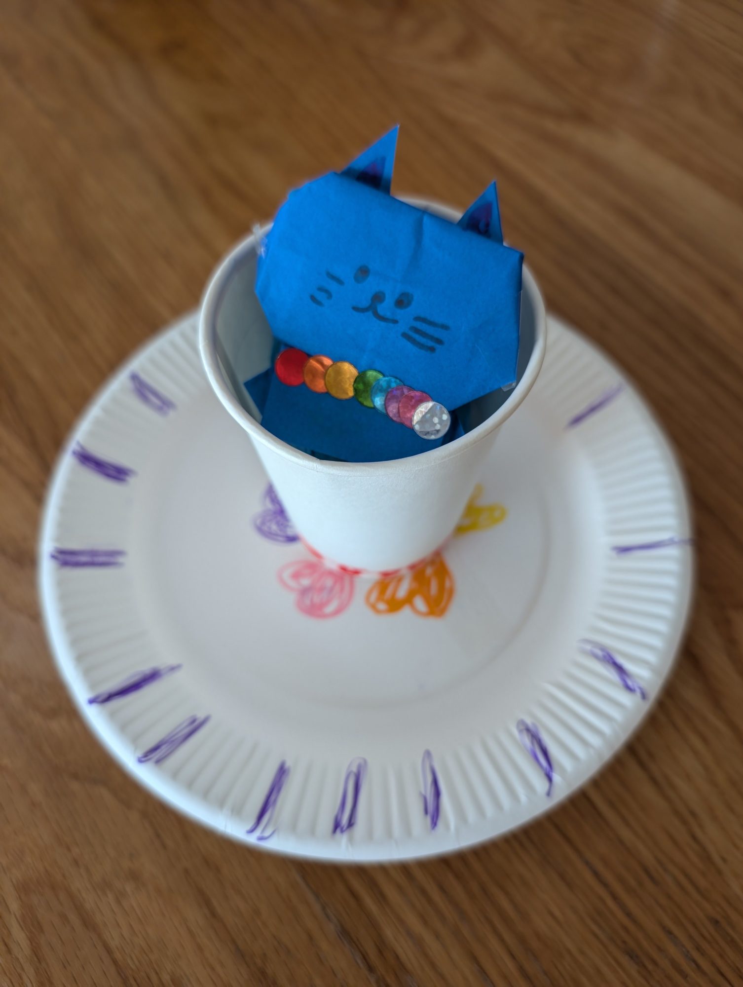 わかめせんせい 先生2026年1月7日 9:35 AM もっちゃん。 紙コップとお皿の組み合わせで、立体の形がとてもおもしろいコマですね。 上下を反対にした構造のおかげで、回ったときの安定感や広がりが想像できます。 中から顔を出す青いねこちゃんと、胸元のキラキラした色の並びが、 動きの中で表情を変えそうで、目がひきつけられました 🎠🐱✨ 「コーヒーカップみたい」という言葉から、 くるくる回る楽しさや、ちょっとドキドキする気分が伝わってきます。 私は、遊びの体験を形にしようとした発想が、とても豊かだと感じました。 回す・見る・想像するが、ひとつにつながっています 😊🌈 このコマ、 もっと速く回したら、ねこちゃんはどんな顔になりそうかな? ログインして返信する ↓