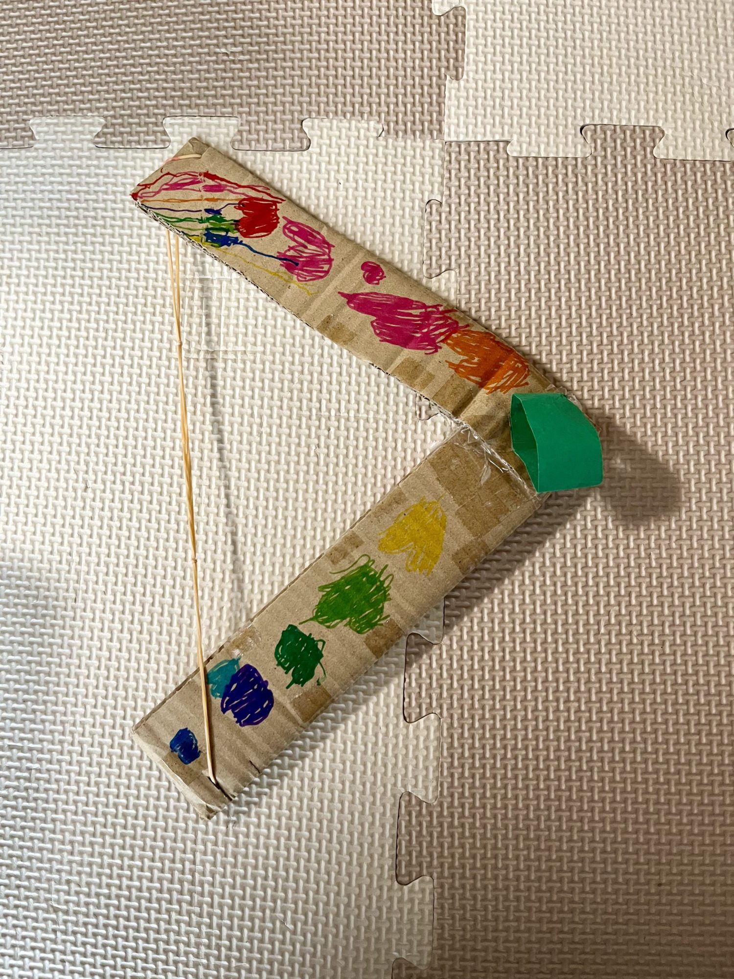 段ボールの形をいかした弓矢に、点々と置かれたハートが目に入ってきます。色の並びがリズムのようにつながっていて、矢が進む道すじまで描かれているみたいですね💘🌈🎯
