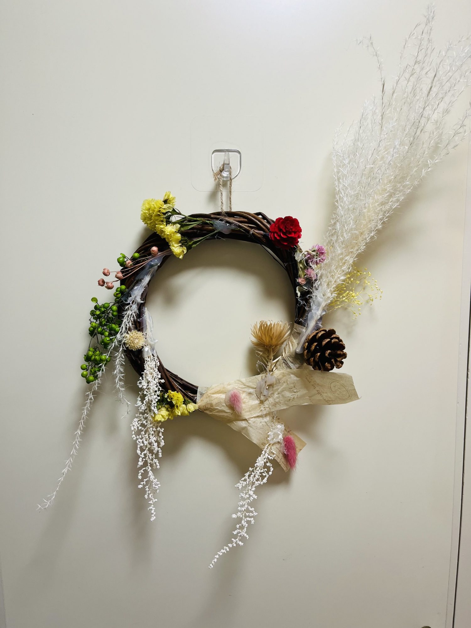 なこさんの「お花」は、輪っかの形の中に、たくさんの素材と気持ちがぎゅっと集まった作品ですね。