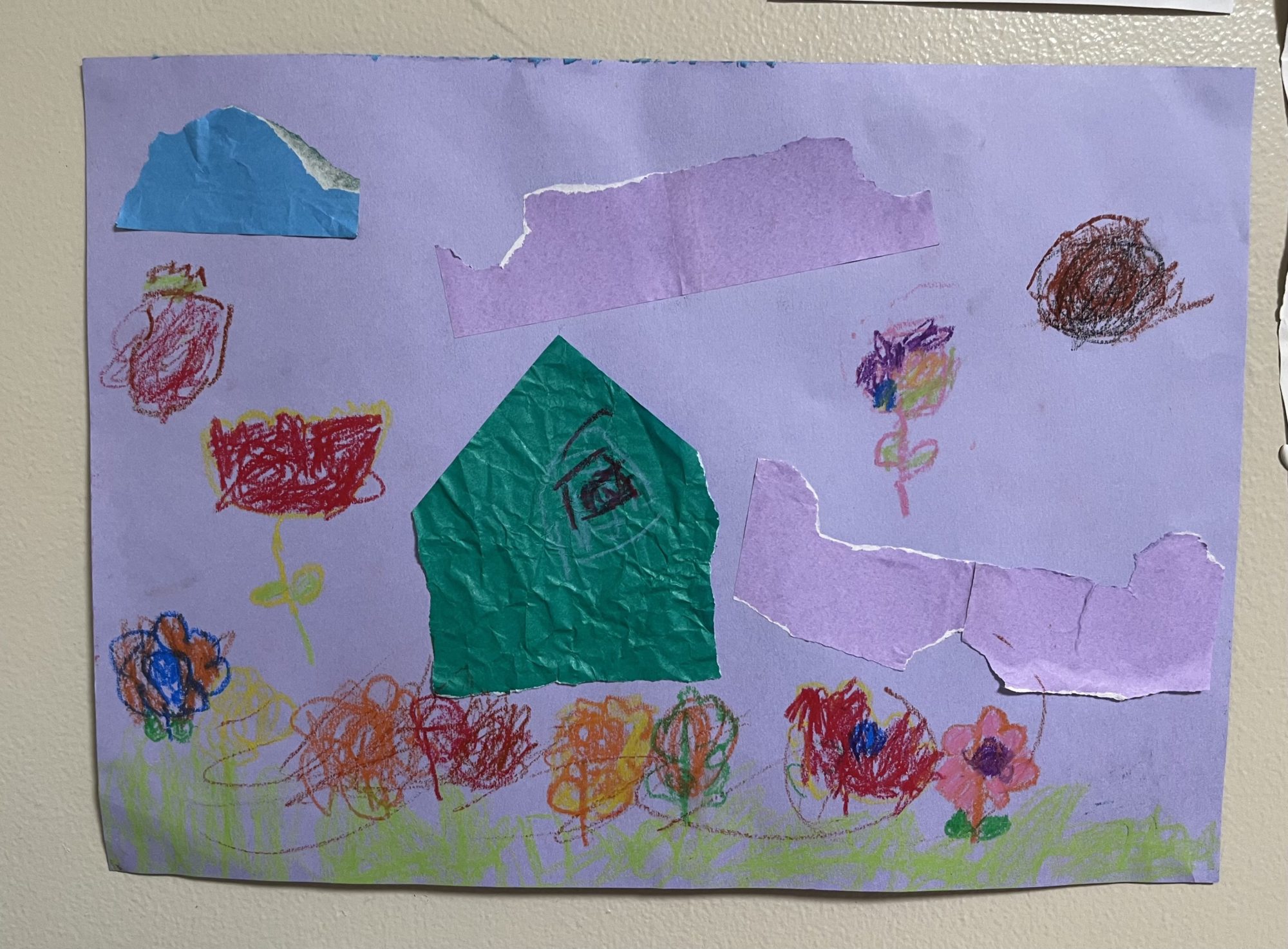 紫の空に、ちぎった折り紙がふわっと流れていて、本当に風が動いているように見えます。しわのある緑の家は、風を受け止めながらそこに立っている感じがして、下に並んだたくさんのお花のクレヨンの線も、ゆらゆら揺れているみたいですね。