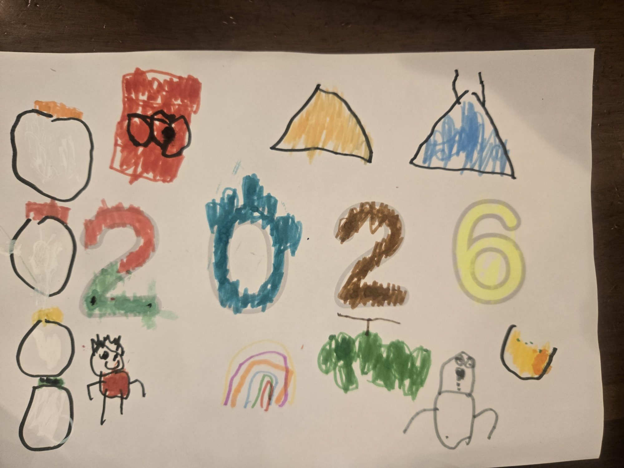 画面いっぱいに「すき」がならんでいて、見ているだけで楽しい気持ちになります。おせちや富士山、ピラミッド、雪見だいふく、シャインマスカット…形も色もそれぞれちがっていて、思い出やワクワクがそのまま絵になっていますね。数字の「2026」も、まわりのモチーフと自然につながって見えました。