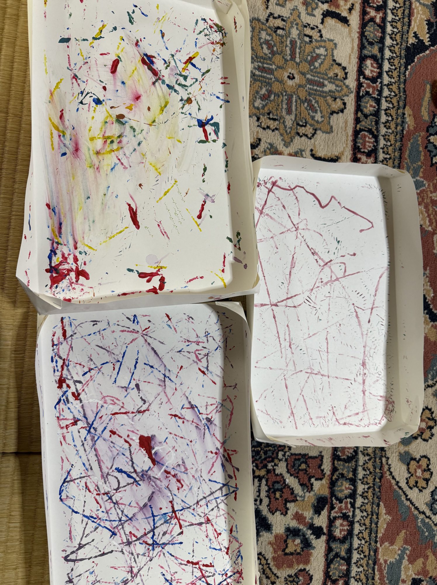 わかめせんせい 先生2026年1月12日 9:16 AM ちゅーたさん。 スーパーボールで転がしたあとが、 3つともぜんぶちがっていて、 見ているだけでワクワクします😊⚪️🎨 同じやり方なのに、 ギザギザが多いところ、 スーッと流れたところ、 色が重なってドキッとするところがあって、 ボールが動いた道のりが そのまま絵になっていますね➰✨ 特に、 色がパッと飛んだところや、 重なってにじんだところが、 「たまたま」が生まれた感じで とてもおもしろいです🎵 トレーの形もあいまって、 それぞれがちがう気持ちをもった コロコロアートみたいに見えます😊 もしまたやるとしたら、 大きいボールと小さいボール、 どっちを転がしてみたいかな? ログインして返信する ↓