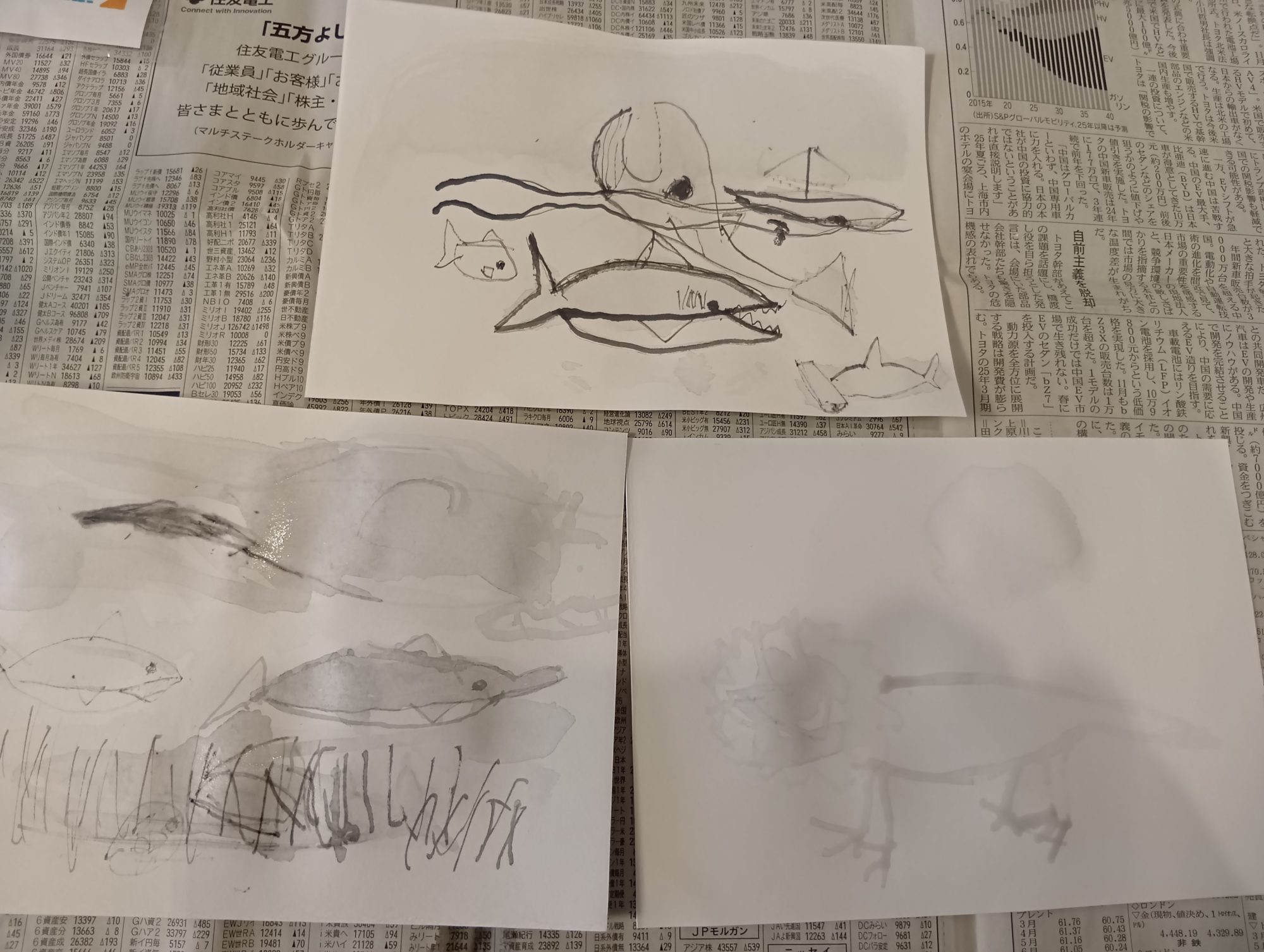 わかめせんせい 先生2026年1月12日 9:20 AM hsmitakaさん。 はじめての墨、しかも小さなキャンバスで、 ここまで「うみ」と「りく」の生きものを 描き分けようとしたこと自体が、 とてもいいチャレンジだと思います🖤✨ 上の作品では、 線がスッと強く走っていて、 魚や大きな生きものの動きが 一気に伝わってきますね🐟🌊 迷いの少ない線は、 「こう描きたい!」という気持ちが そのまま出ている感じがします。 下の作品では、 墨がにじんだり、 うすく残ったりしていて、 空気や水の中に 生きものが溶けこんでいるようです🌫️ 濃淡を意識していたことが、 ちゃんと画面にあらわれています。 墨は、 思い通りにいかないところが いちばんおもしろい画材です。 にじみやかすれは、 失敗ではなく「景色」になります😊 もし次に描くとしたら、 「うみの音」や「りくのにおい」を 墨で描くとしたら、 どんな濃さにしたいですか? ログインして返信する ↓