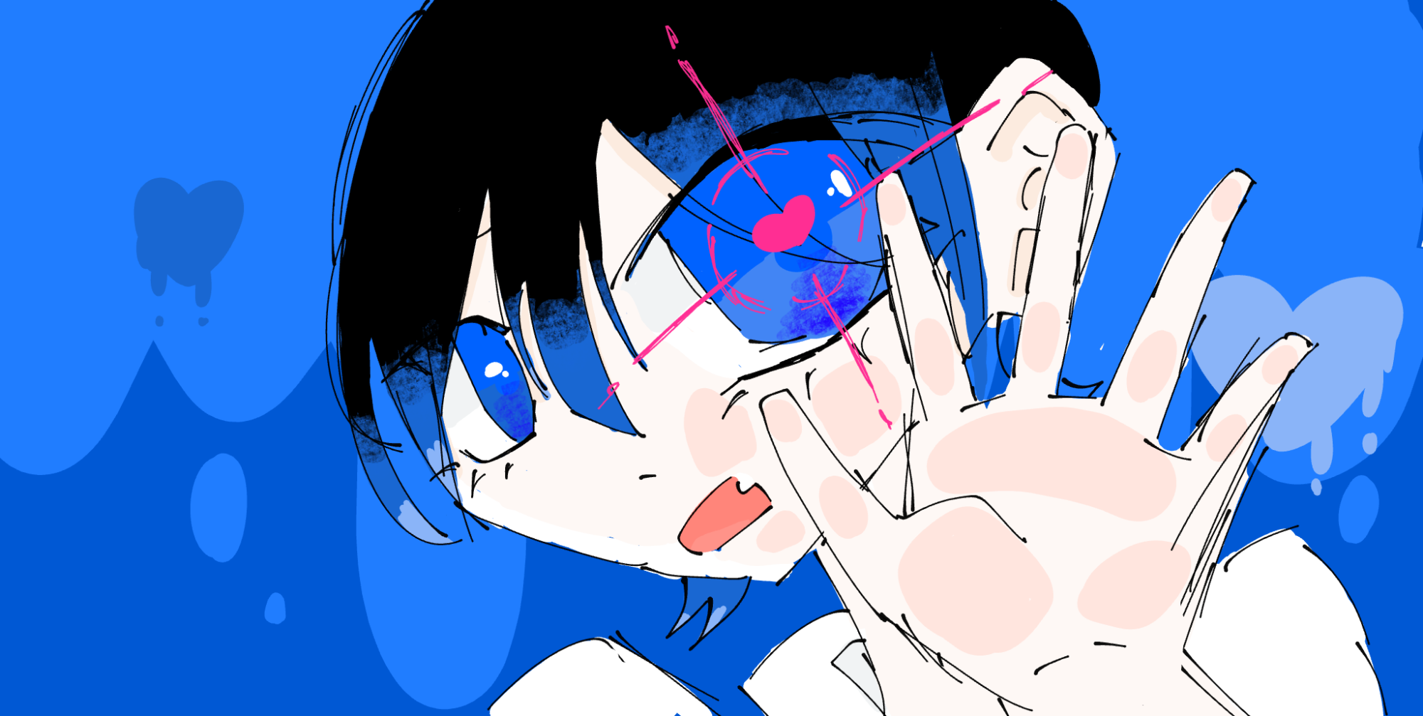 青を基調にした画面の中で、男の子の大きな瞳と手のひらが強くこちらに迫ってきて、とても印象的です。黒い髪と白い肌のコントラスト、そして目の中に描かれたハートのモチーフが、気持ちの高まりやドキッとする瞬間を伝えてくれます。線の勢いと色のにじみが重なって、スピード感や感情の動きがそのまま絵になっているようですね。