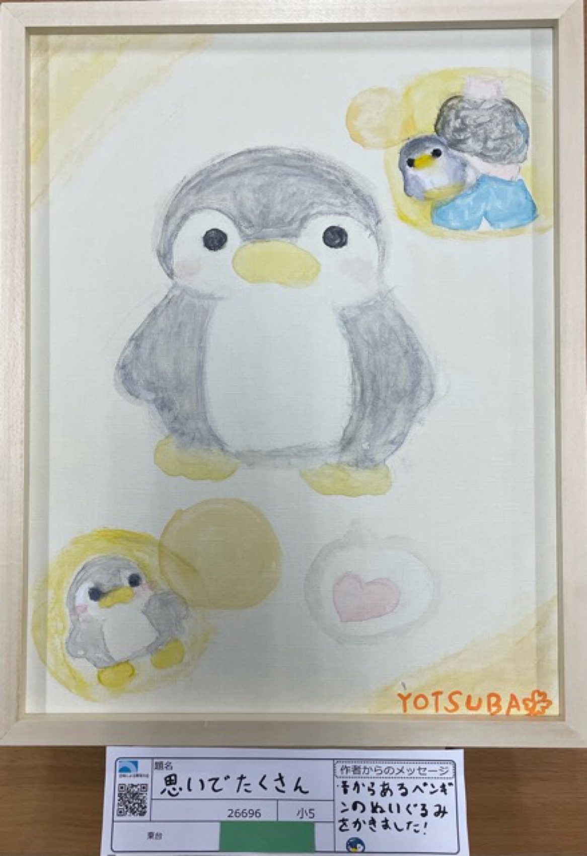 桃から生まれたももこ先生 先生2026年1月17日 8:34 PM よつばちゃんへ こんばんは! 今日はご家族で来てくれたのに、 お話のあと探してみたら、もう帰られていて… お話できずにごめんなさい。 今回の展覧会の絵は、あたたかくてやさしい色づかいで、 ペンギンちゃんへの愛情がたくさん感じられる とても素敵な作品ですね。 「ペンギンといえばこの色」という決まった色ではなく、 よっちゃん自身のイメージに合った、 やさしいグレーに近い、透明感のあるうすい色を選んでいるところに、 よっちゃんのセンスの良さを感じました。 そして、表情が…かわいすぎます! 画面の構成も本当にピカイチで、 余計なものを描かず、シンプルにまとめているからこそ、 ペンギンの存在感がいっそう際立っていますね。 毎年、確実にレベルアップしているよっちゃん。 これからの成長がとても楽しみです! ログインして返信する ↓