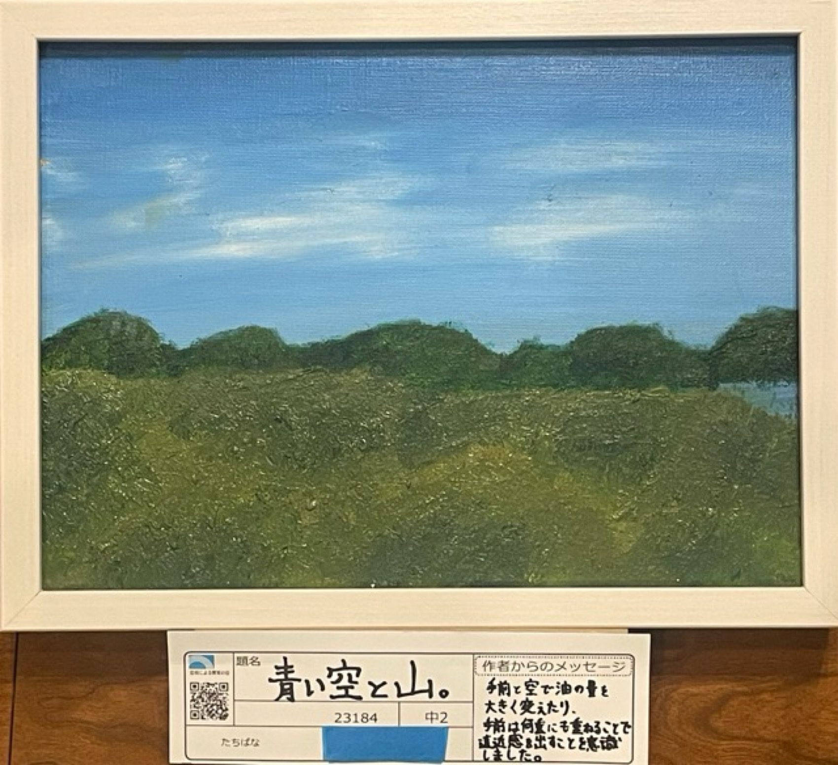題名カードに書かれていた「筆と絵の具の量を大きく変えたり、何度も重ねることで表現した」という言葉から、試しながら確かめる時間を大切にした様子が伝わってきました。その積み重ねが、この落ち着いた景色につながっているように感じます。