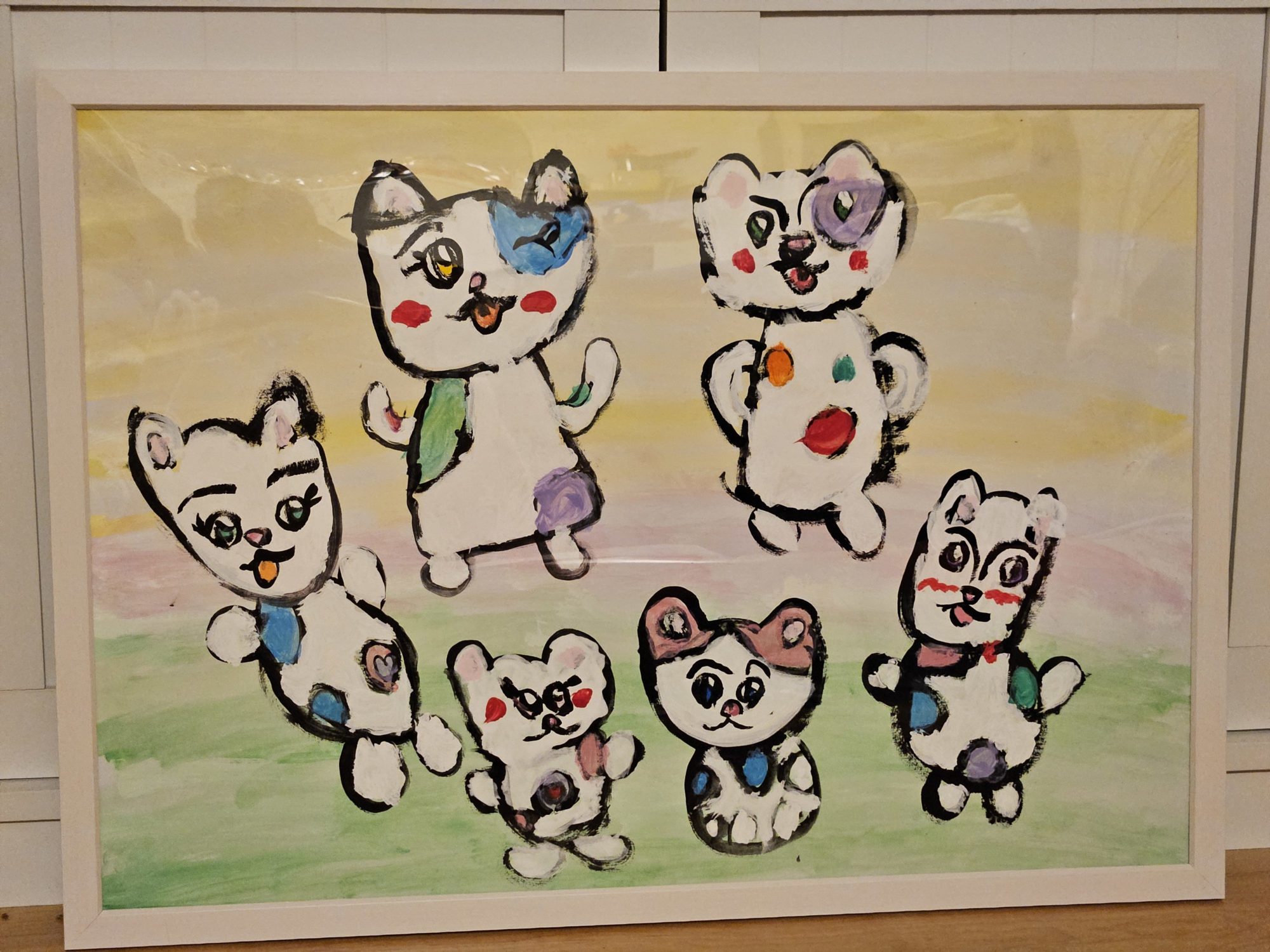 画面いっぱいに、猫ちゃんファミリーがのびのびと並び、それぞれの表情や動きのちがいがとても楽しい作品ですね。太い黒い線で形をはっきり描き、その中に赤や水色、むらさきなどの色が入り、家族一人ひとりの個性が自然に見えてきます🐱