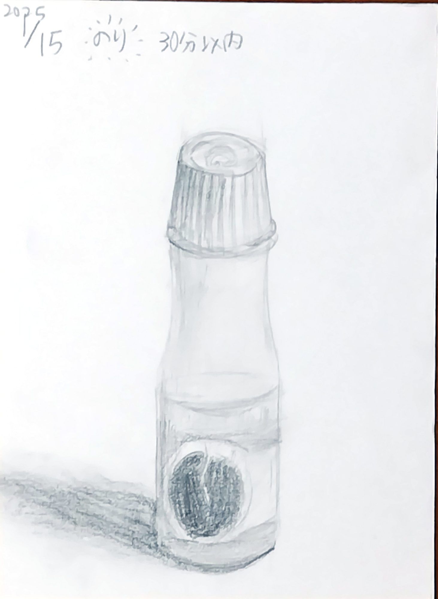 画面の中央に立つのりの形が、すっと安定して見えて、静かな存在感があります。円柱の胴体や、少し広がった底、ふたの段差まで、線の重なりで丁寧に捉えられていて、時間をかけて見つめた様子が伝わってきました。影も床にやわらかく広がり、置かれている空間が感じられます🙂