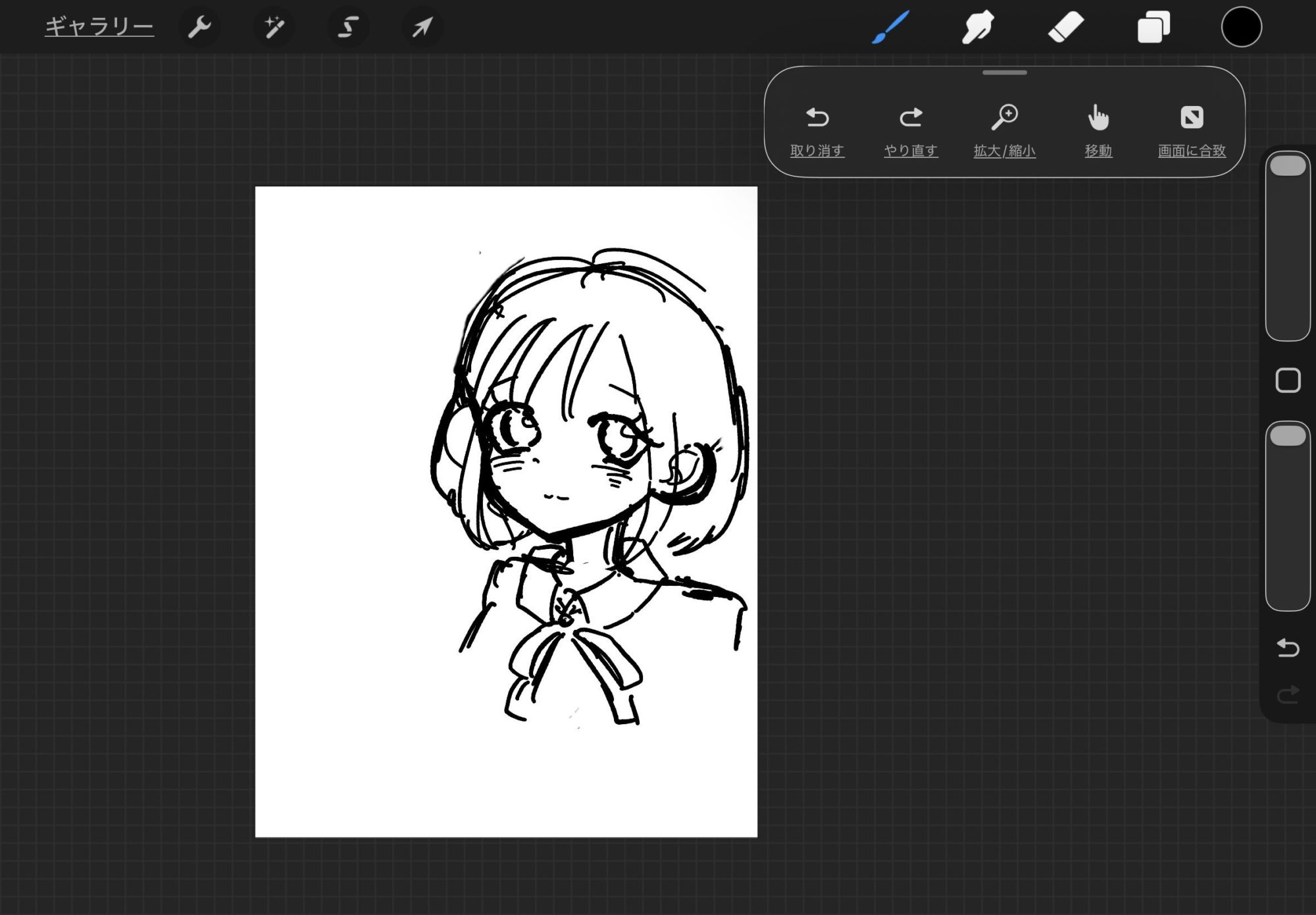 画面の中央に描かれた女の子は、やわらかな線でまとめられていて、静かにこちらを見つめている表情がとても印象的です。前髪や輪郭の線に強弱があり、目や口も最小限の線なのに、その子の性格まで想像できるところに、丁寧な観察が感じられました🙂