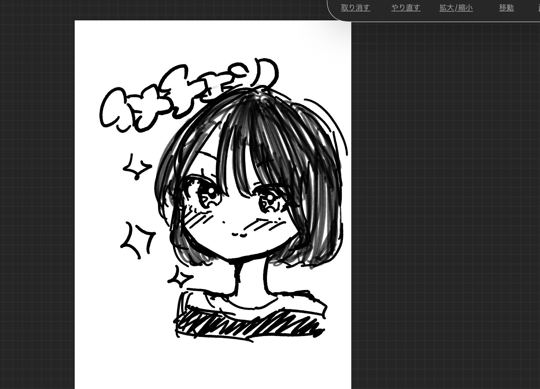 画面の中央に描かれた女の子の顔と髪型が、すっと目に入ってきます。黒い線を重ねて描かれたボブの髪は、量感がしっかり伝わり、切ったあとの軽やかさとまとまりの両方を感じました。目の中のきらっとした描き込みや、ほほの赤みが表情を生き生きさせています✨