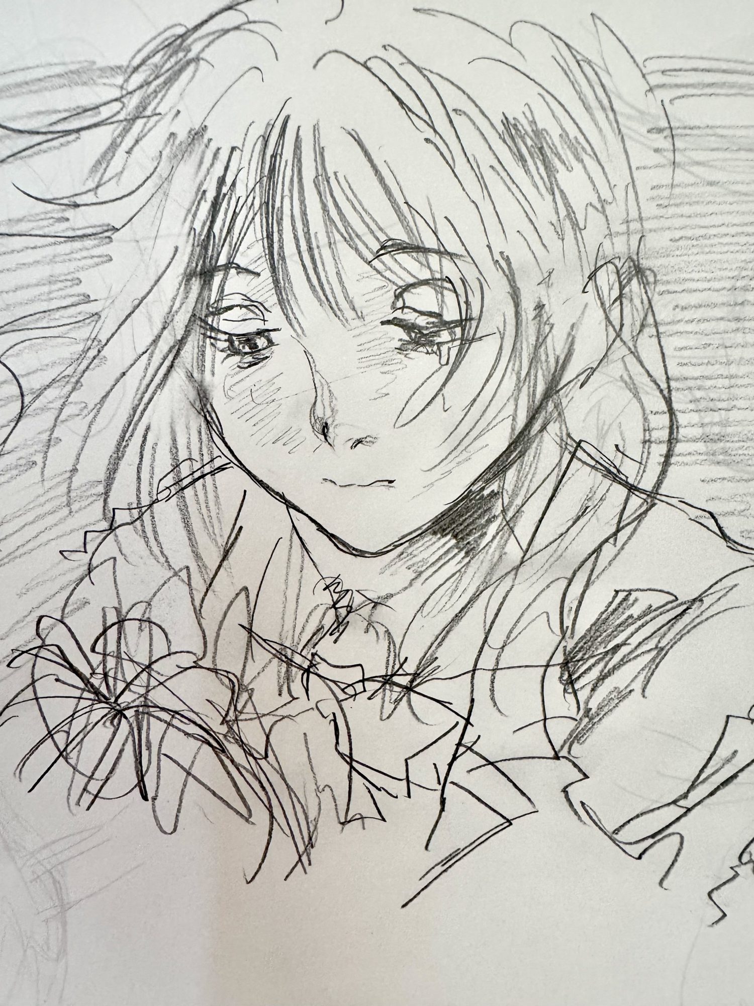 鉛筆の線が重なり合いながら、顔の輪郭や目元、髪の流れが自然に立ち上がってきていて、とても印象的です。特に目のまわりの線の強弱や、少し伏し目がちな視線から、静かな時間の気配が伝わってきました。ラフな線と、丁寧に探っている線が同居しているところが、この絵ならではの魅力です✏️