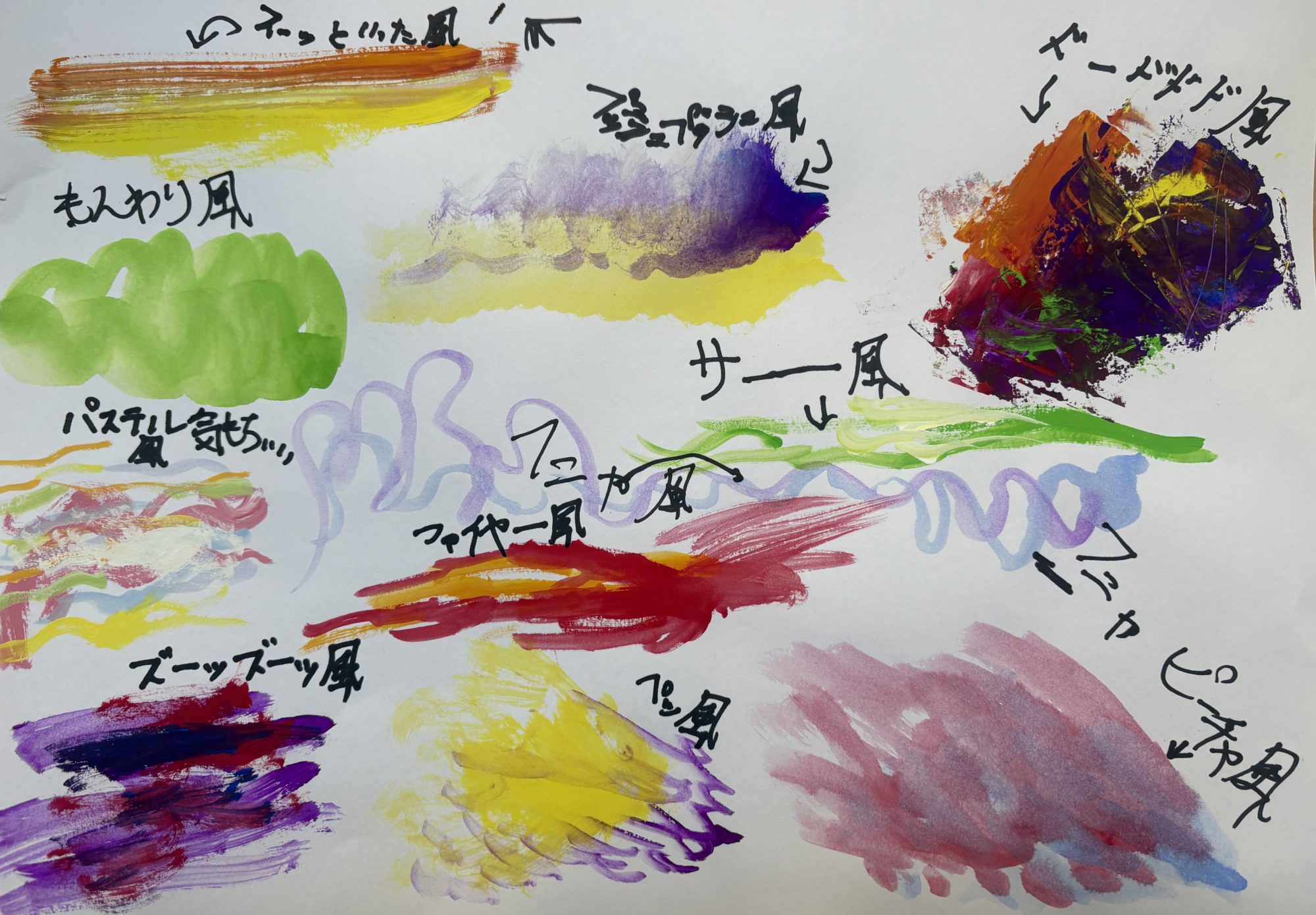 紙いっぱいに広がる色と線から、いろいろな「風」のちがいがはっきり伝わってきます。やわらかくにじむ色、スッと流れる線、重なって荒れるような筆あとなど、筆の動きや強さが一つひとつ変えられていて、見ている私の目も行ったり来たりしました🍃🎨