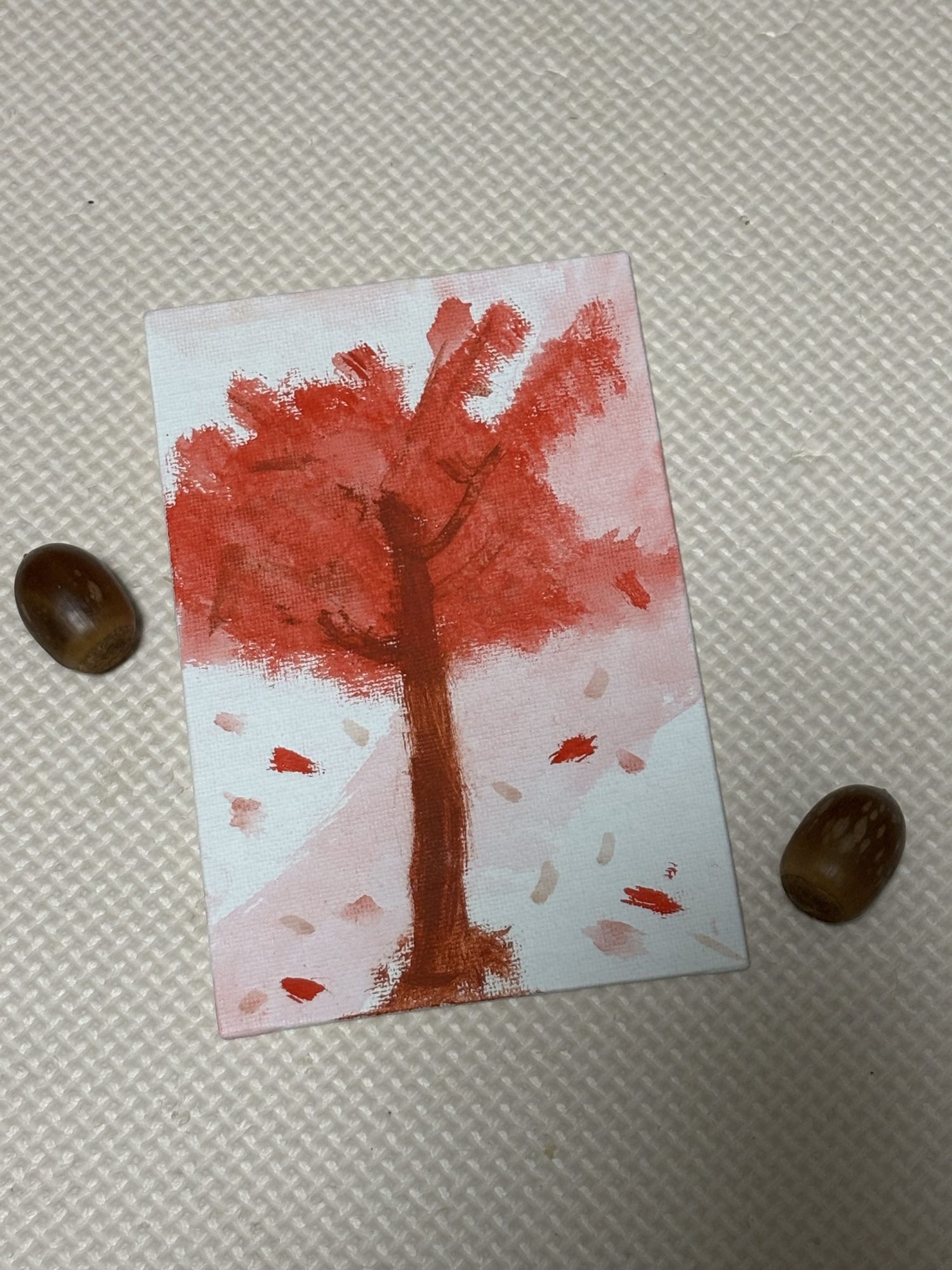 画面いっぱいに広がる赤い葉っぱが、とてもいきいきしています。木の幹はしっかりと立ち、上に向かって枝が伸びる形がはっきりしていて、そのまわりに舞う葉っぱの動きがよく伝わってきました。アクリル絵の具の厚みと、水性ペンの軽やかな線が重なり、風の通り道が見えるようです🍁