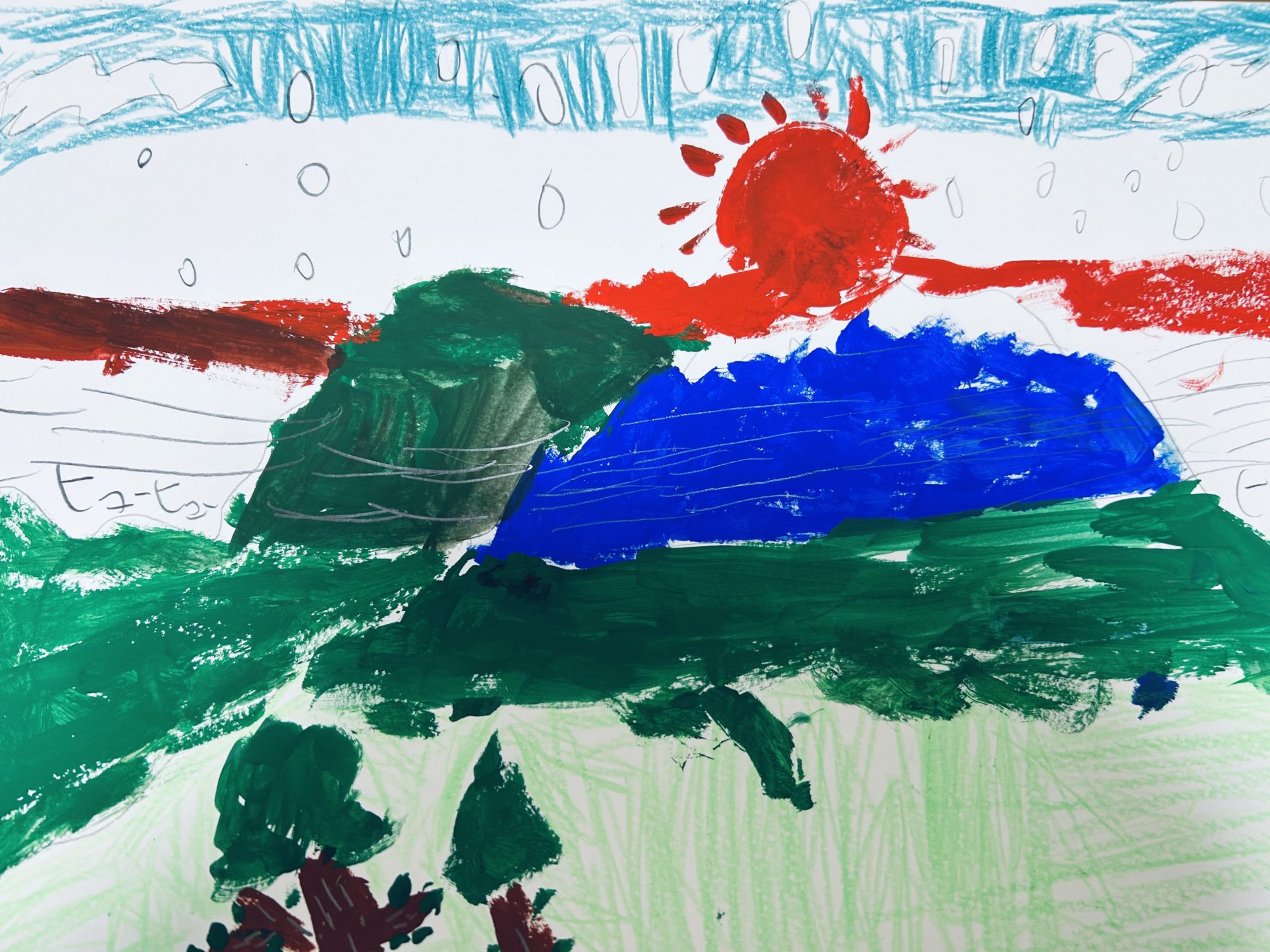 わかめせんせい 先生2026年1月25日 10:51 AM hiroki さんへ。 画面いっぱいに広がる緑の大地と、力強い青い富士山。その上に重なる赤い太陽と横に流れる雲のような線が、空の動きをはっきり伝えています。上部の水色の線や、白く描かれた点々が、降り続く雪と冷たい空気を感じさせます❄️🗻 「富士山に吹く風」「雪が降っていて冷たい風」という言葉どおり、景色が止まらずに動いているようで、冬の山の厳しさや静けさが一緒に伝わってきます。色を重ねながら、大きな形で風景をとらえているところに、強いイメージを持って描いている様子を感じました🌬️ 私は、この絵を見て、山に立ったときに頬に当たるキンとした空気を想像しました。寒さの中でも、景色をじっと見つめている時間のようです✨ この富士山のまわりで、風はこれからどんな動きをしていくと思いますか? ログインして返信する ↓