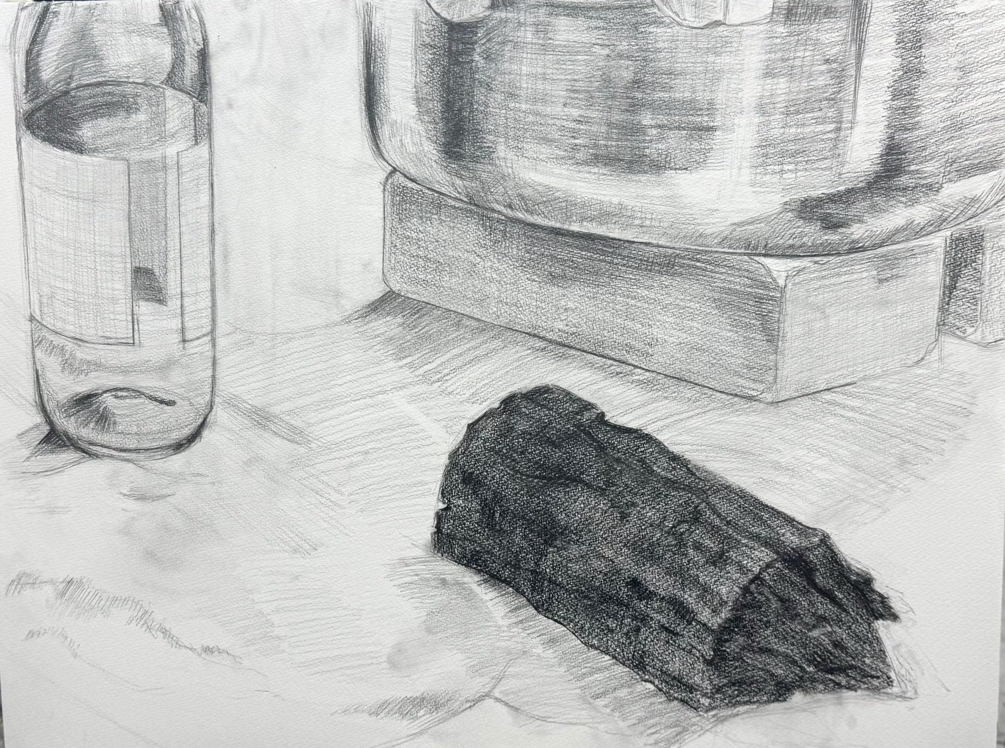 わかめせんせい 先生2026年1月25日 1:10 PM ちあきさん、 「鍋やらかした」という言葉、正直でいいなと思いました。 前回の下書きから比べると、 手前の木炭は量感も重さもぐっと増していて、 空間の手前をしっかり支える存在になっています。 置かれている感じ、触れたときの硬さまで伝わってくるのがいいですね。 一方で、違和感の正体は「鍋の入れ方切り方」構図かな? これは失敗というより、 構図を意識して描けているからこそ生まれた感覚。 かなり良いところまで来ています。 このデッサンで一番大事なのは、 「やらかしたかも」と立ち止まれたこと。 このモチーフでのねらいは、ガラス、金属、木炭、レンガの材質感や重さの違いや関係性を表現することですね。 ログインして返信する ↓