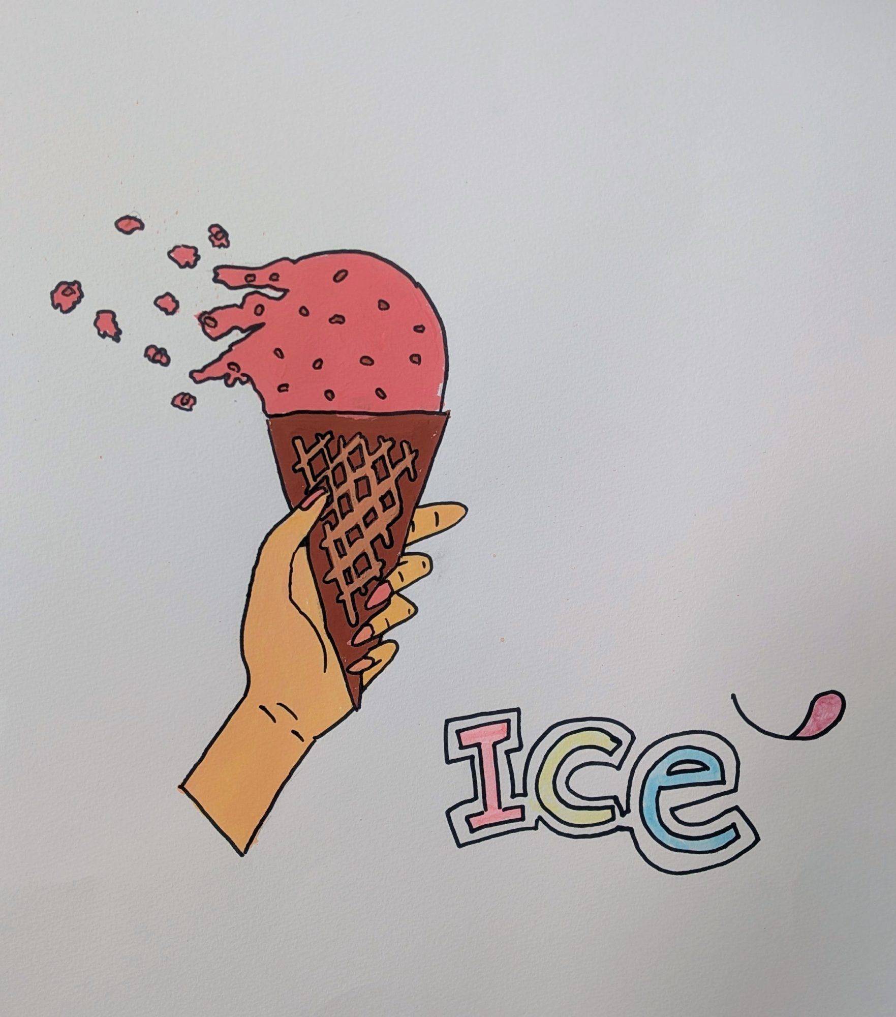 手に持ったアイスが、風にあおられて今にも飛んでいきそうな瞬間が、ぱっと一目で伝わってきました。アイスの形が少しずつちぎれて散っていく描き方や、空白を大きく使った構成が、風の強さやスピードを感じさせます🍦💨