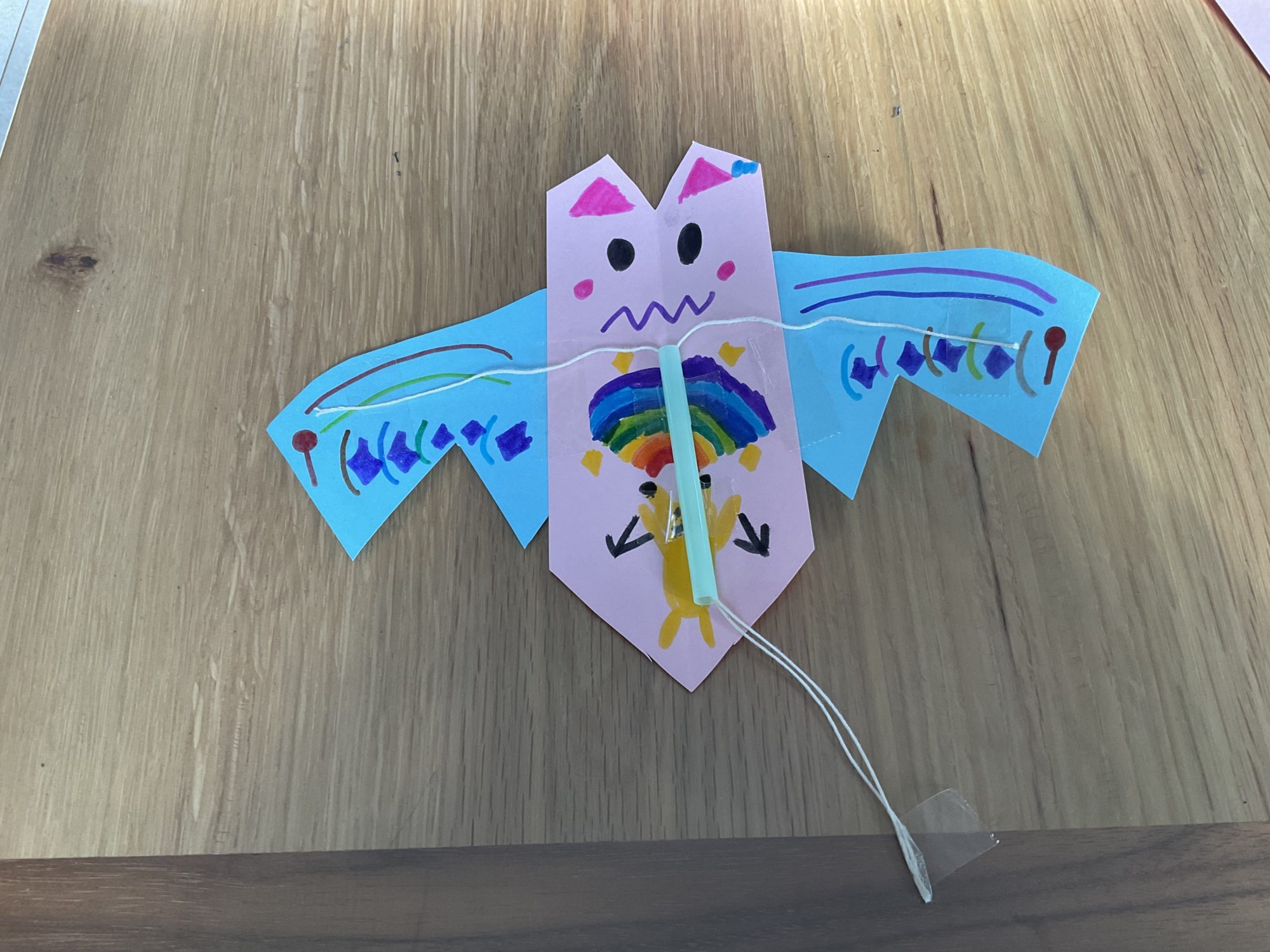 わかめせんせい 先生2026年1月25日 1:45 PM sanaさん、 「恥ずかしがり屋」という言葉が、見た瞬間にすっと伝わってくるコウモリですね。 羽を大きく広げているのに、顔はちゃんと隠している。その動きそのものが、気持ちを語っていて、とてもかわいいです。 左右の羽の形や模様も、それぞれ少しずつちがっていて、「パタパタしている途中」の感じがよく出ています。まっすぐじゃなく、少しギザギザしているところが、コウモリらしいドキドキ感につながっていますね。 体のまん中に描かれたにじ色も素敵です。 外からは見えないけれど、コウモリの中にはこんな気持ちがあるのかな、と想像したくなります。顔は隠しているのに、心はちゃんと見えているところが、この作品のおもしろさだと思います。 もし次に作るとしたら、 「このコウモリは、どんなときにそっと顔を出すのかな?」 そんな続きを考えてみるのも、楽しそうですね。 ログインして返信する ↓