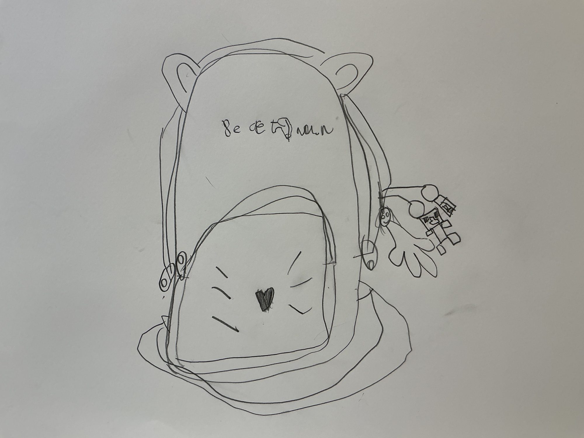 自分とマイクラのクリーパー、消しゴムまで想像して描いたところが、この絵のいちばん楽しいポイントですね。形を省略しながらも、「ついている」「ぶらさがっている」感じがちゃんと出ていて、カバンの動きまで想像できます。