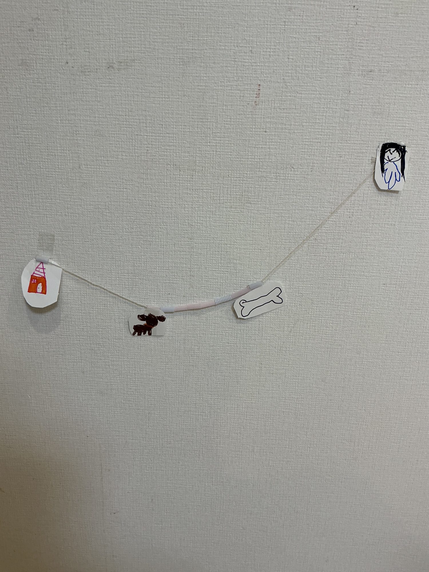 わかめせんせい 先生2026年1月26日 7:00 AM みいちゃん、作品を拝見しました。 一本の糸に、小さな絵が順番につながっていて、視線が自然と右から左へ動いていきます。糸のゆるやかなカーブが、そのまま「歩く」「追いかける」動きになっているところが、とてもおもしろいですね 😊 わんちゃん、お家、骨、そして追いかける私。 一つ一つはシンプルな形なのに、並び方によって、ちゃんとした物語が生まれています。私は、この作品から「急いでいるけど、どこか楽しい気持ち」を感じました 🐕🦴 描くだけでなく、切って、つないで、壁にかざることで、絵が空間の中で生きはじめています。絵と工作、考えることが自然につながっているところに、これからの広がりを感じました ✨ 作者コメントにあるように、「追いかける」気持ちが、とても伝わってきます。 このあと、みんなはどこにたどりついたと思いますか? 🌱 ログインして返信する ↓