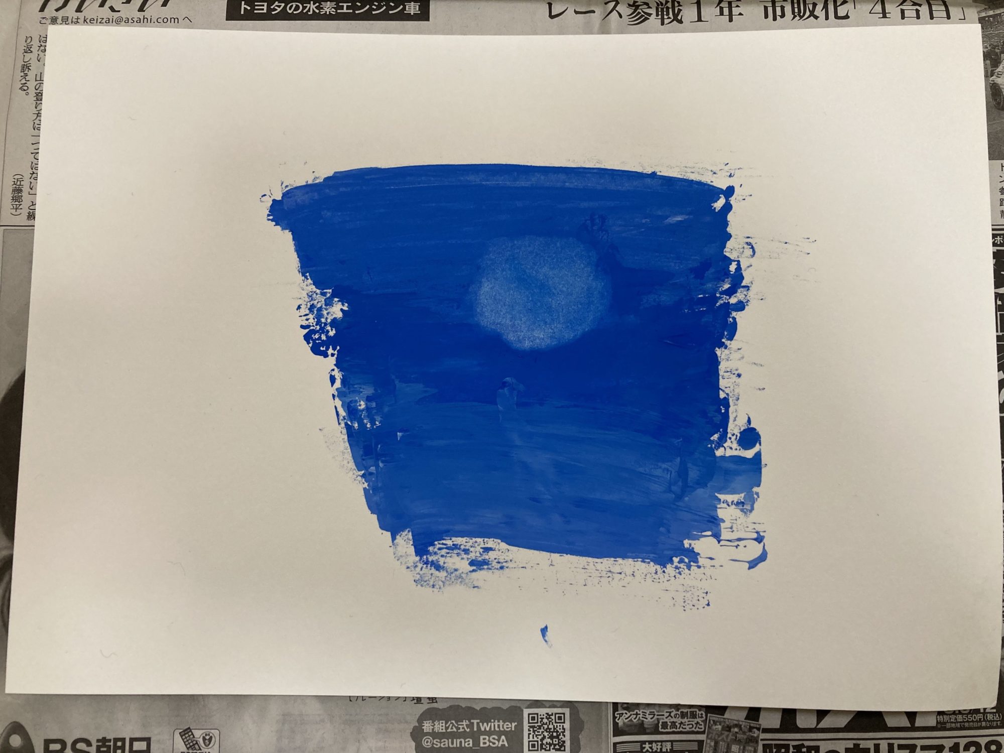 「すぐ絵の具がなくなって、かすれてしまった」という言葉からは、思い通りにいかない素材と向き合った時間が伝わってきました。それでも、ナイフの動きを止めずに画面をつくり切ったことが、この空の強さにつながっているように感じます。色数をしぼったことで、青そのものの表情がよく見えてきました🎨✨