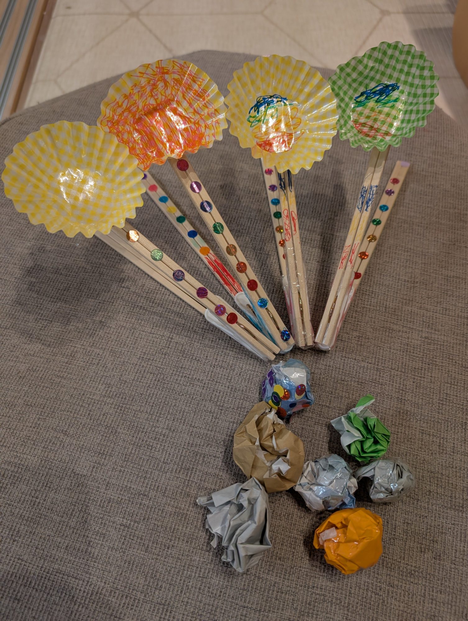 紙コップや棒、丸めた紙がつながって、遊びながら動く仕組みになっているところが、とても生き生きしていていいね。弟さんと協力して4つも作ったという話から、つくる時間そのものが楽しい実験になっていた様子が伝わってきます。的当てにも、わんこへのおやつマシーンにもなるなんて、使い道を広げて考えているところが、私はとても面白いと感じました。絵に描かれた丸や顔も、動くことを想像しながら描いているみたいで、準備のワクワクがそのまま形になっています🐶🥜🎯✨