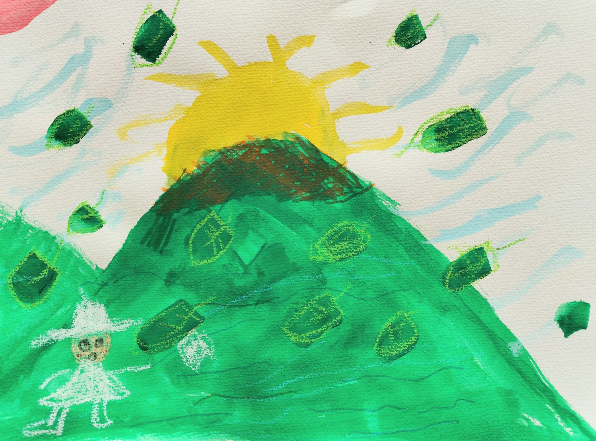 夕日の景色に、葉っぱをとばして風をあらわしました。 白い子は、風の子で、白いタオルをとばされてしまったところです。
