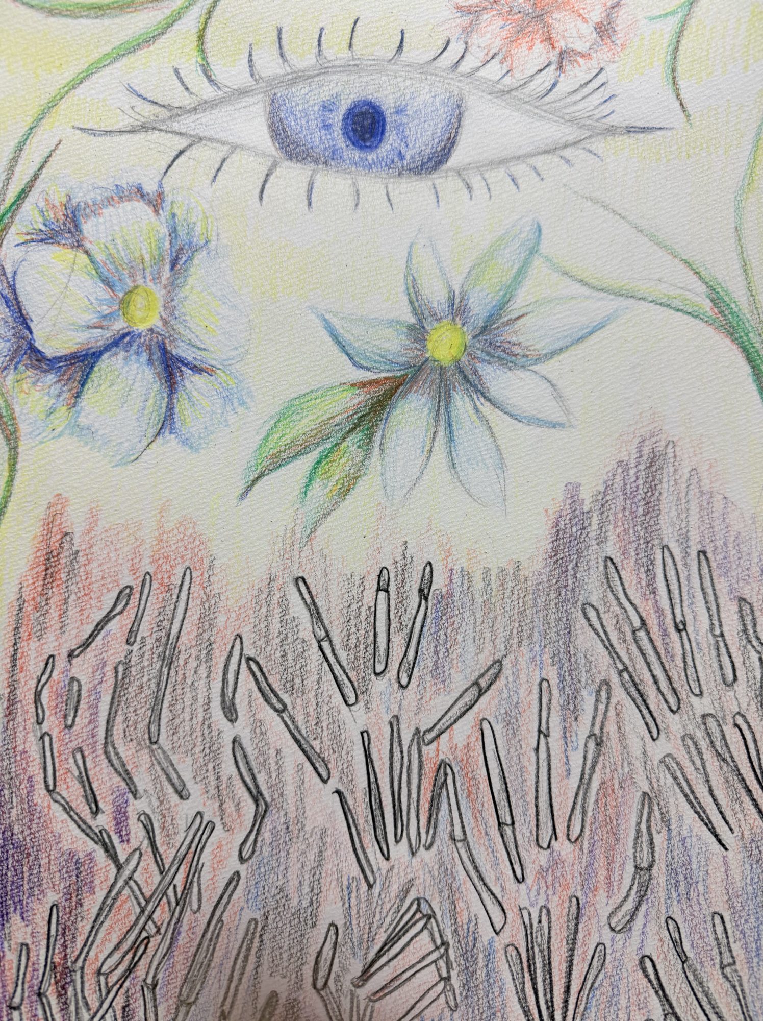 色鉛筆のやさしい重なりで描かれた青い目や花の色が、冷たさとあたたかさを同時に伝えてくるところも印象的です🌼👁️