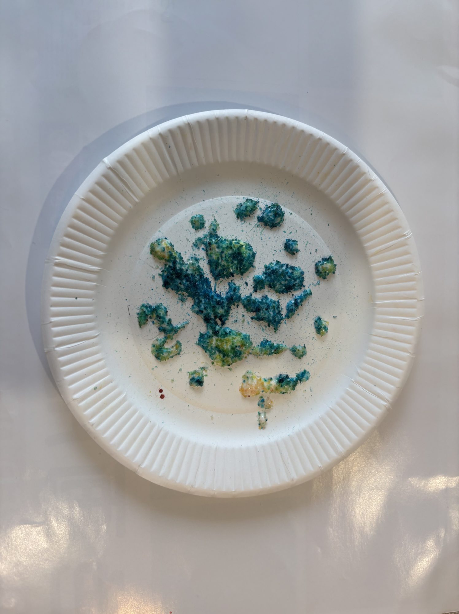 白いお皿のまんなかに、青やみどり、少し黄色が混ざった粒が集まっていて、小さなかけら一つ一つが浮かんでいるように見えていいね。色がにじみ合っているところと、はっきり残っているところがあって、近くで見たり、少し離れて見たりしたくなります。