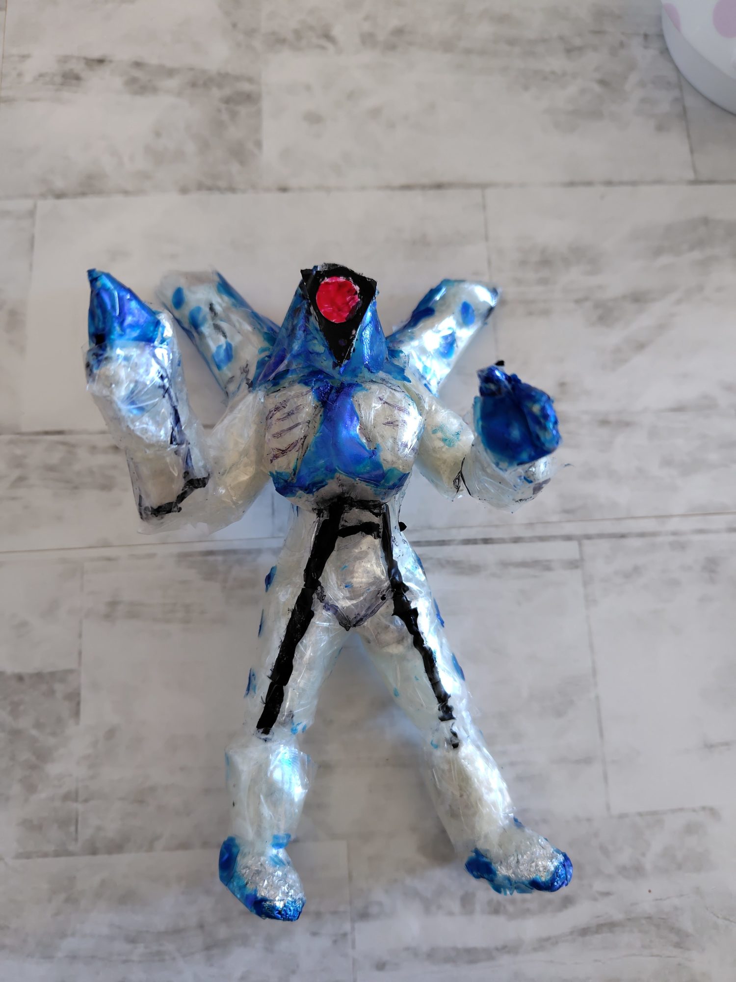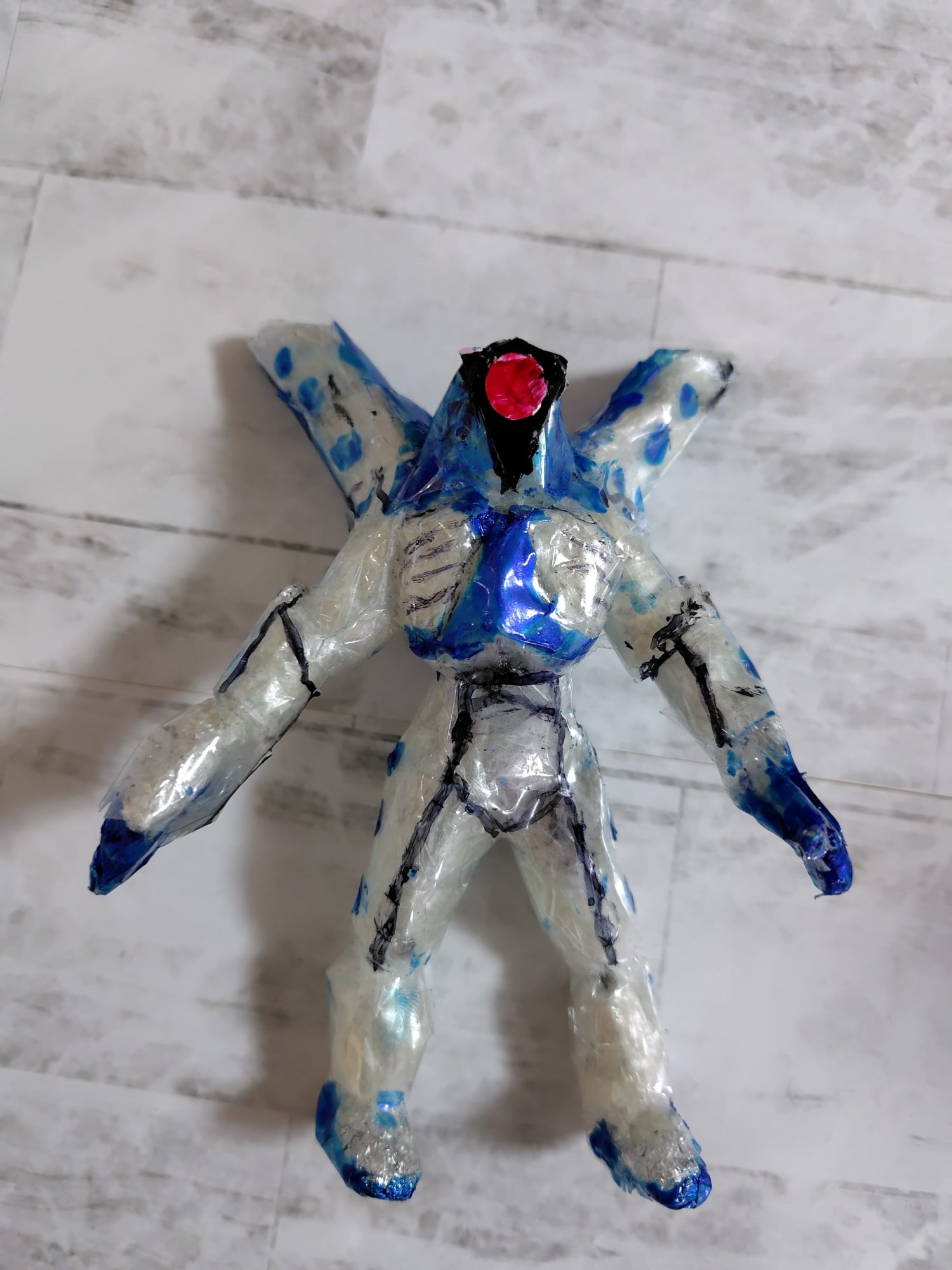 前・後ろ・横、どの角度から見ても、体の厚みや腕の広がりがしっかり作られていて、怪獣がそこに立っている感じが伝わってきていいね。透明な素材の中に青が重なり、場所によって濃さが変わることで、体の中を何かが流れているようにも見えます。背中の大きな突起や、脚の安定感も、この怪獣の力強さを支えています。
