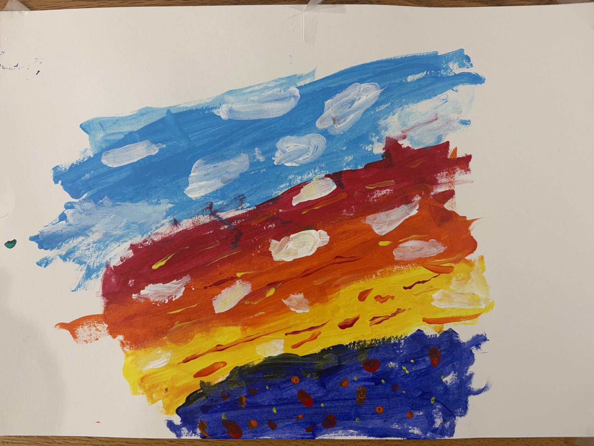 風そのものは見えないのに、色や線の速さや向きで「感じ」を描こうとしているところに、挑戦があっていいね。私は、この絵を見て、時間ごとに風の性格が変わるみたいだと感じました🍃☁️🌅🌙
