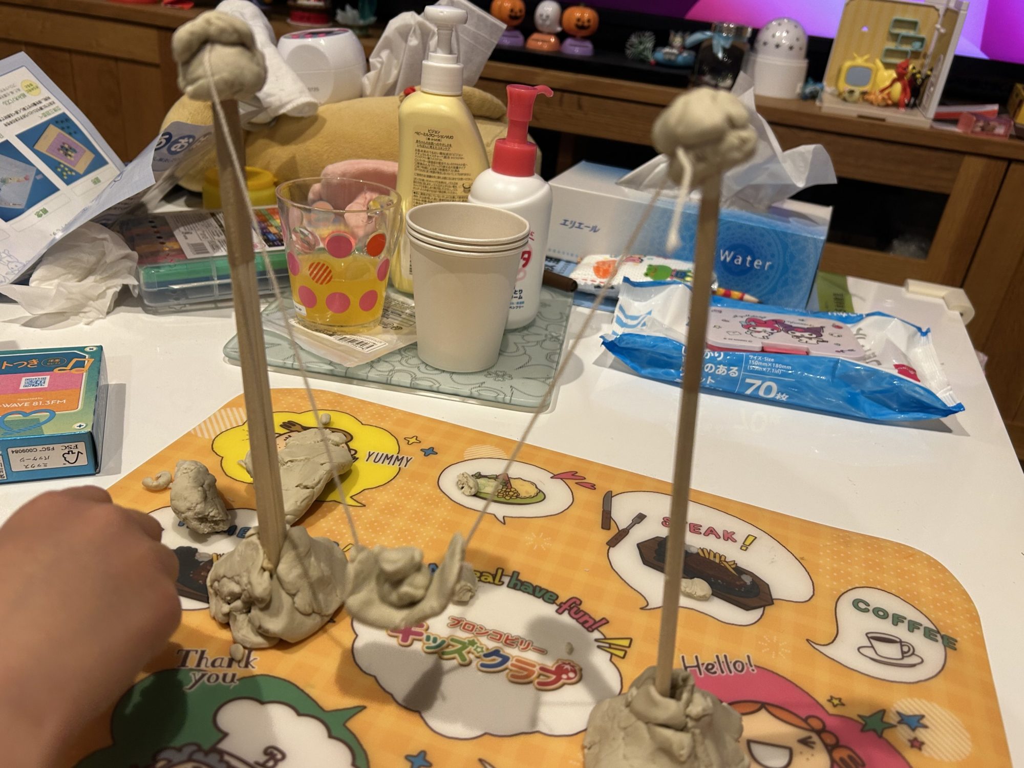 ねんどの土台に、すっと立ち上がる長い棒。そこに糸を張って、空へつながるブランコができましたね。ぐらぐらしながらも何度も立てようとした跡が見えて、挑戦の時間がそのまま形になっていていいね!🪵✨