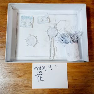 箱の中をまっ白にして、丸いふたやカードのくぼみ、紙コップや細い紙まで並べた世界。ひとつひとつは身近な「いらないもの」なのに、こうして置かれると不思議と花の気配が立ち上がっていていいね!🤍