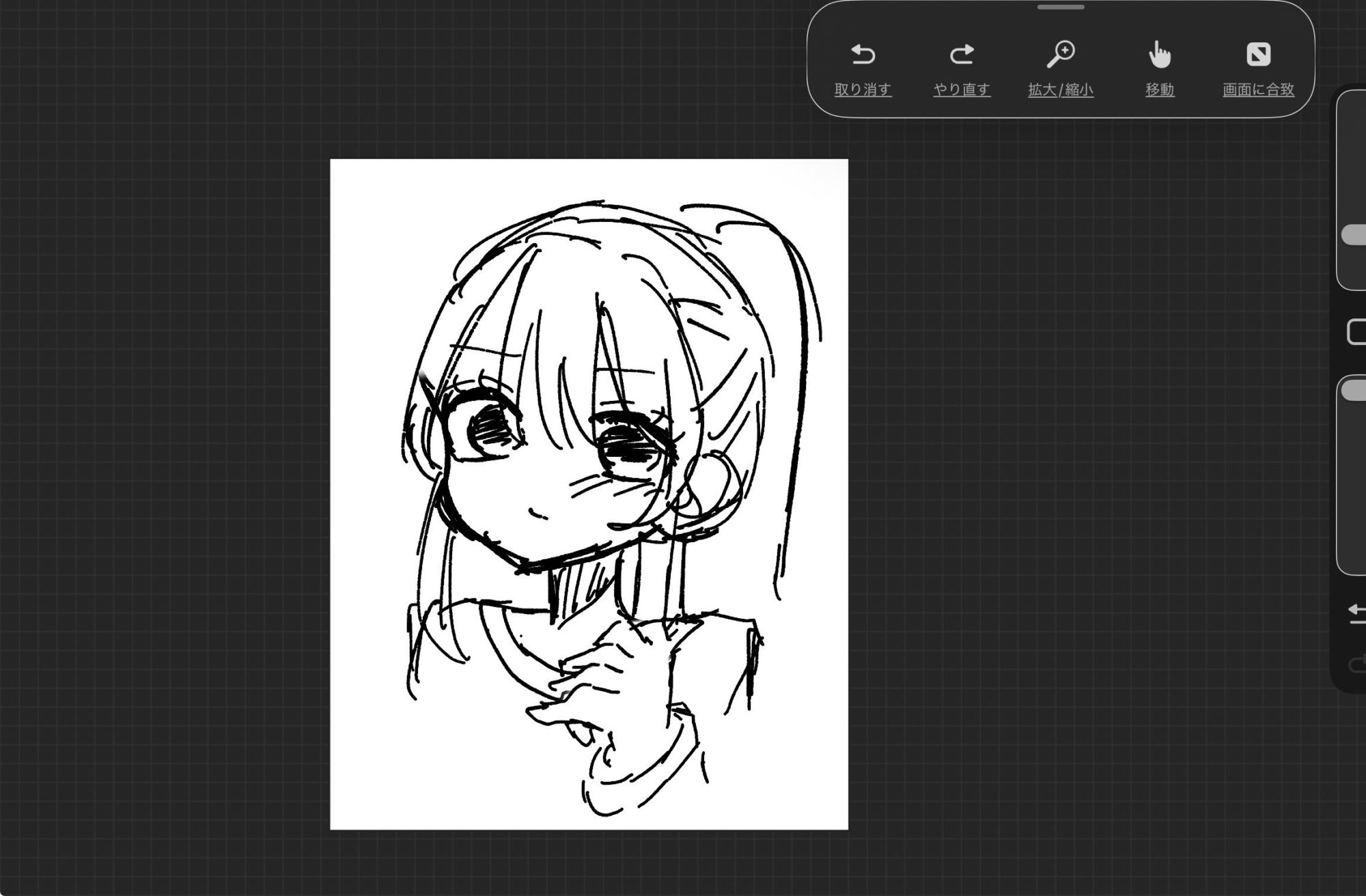 大きな瞳に少し影を落として、じっと横を見るまなざし。前髪の重なりや、ゆれるポニーテールの線が軽やかでいいね。指先を胸元にそっと添えたしぐさも、気持ちをぎゅっと抱えているように見えます。黒一色のラフな線なのに、感情がちゃんと伝わってくるところが素敵です。🖊️✨