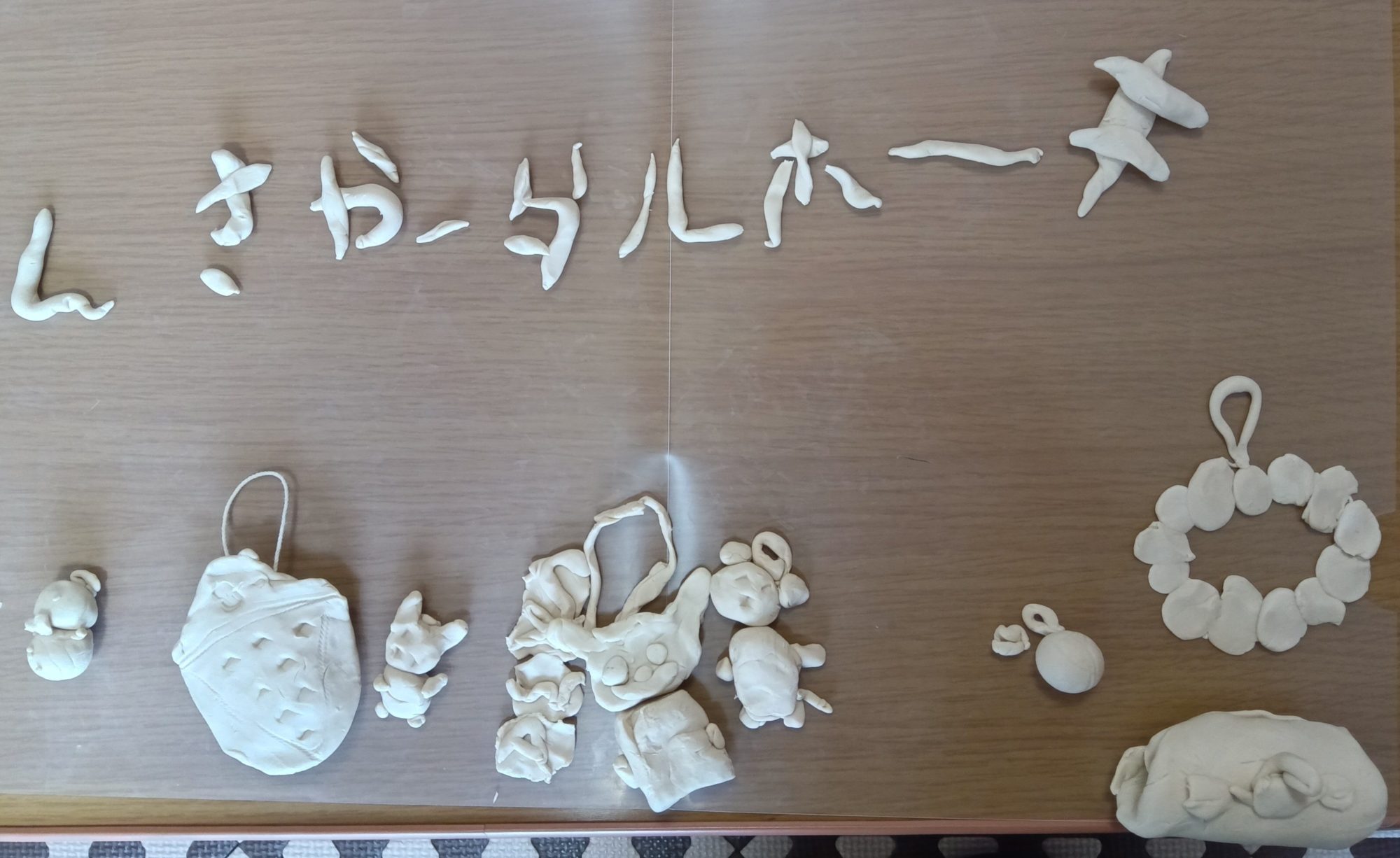 【キーホルダーやさん】の文字も粘土で作りました(右から左に読む感じですが(笑))。