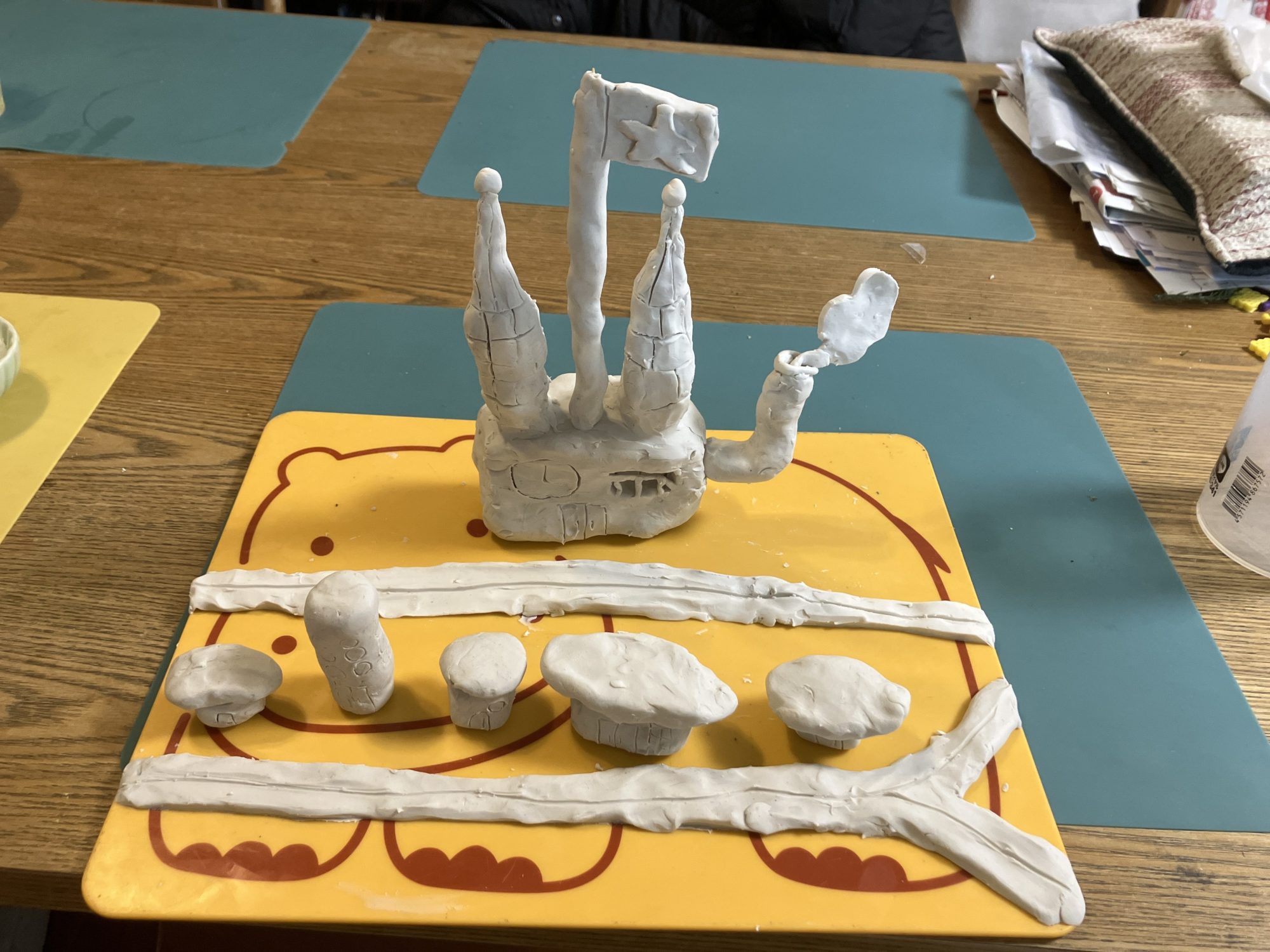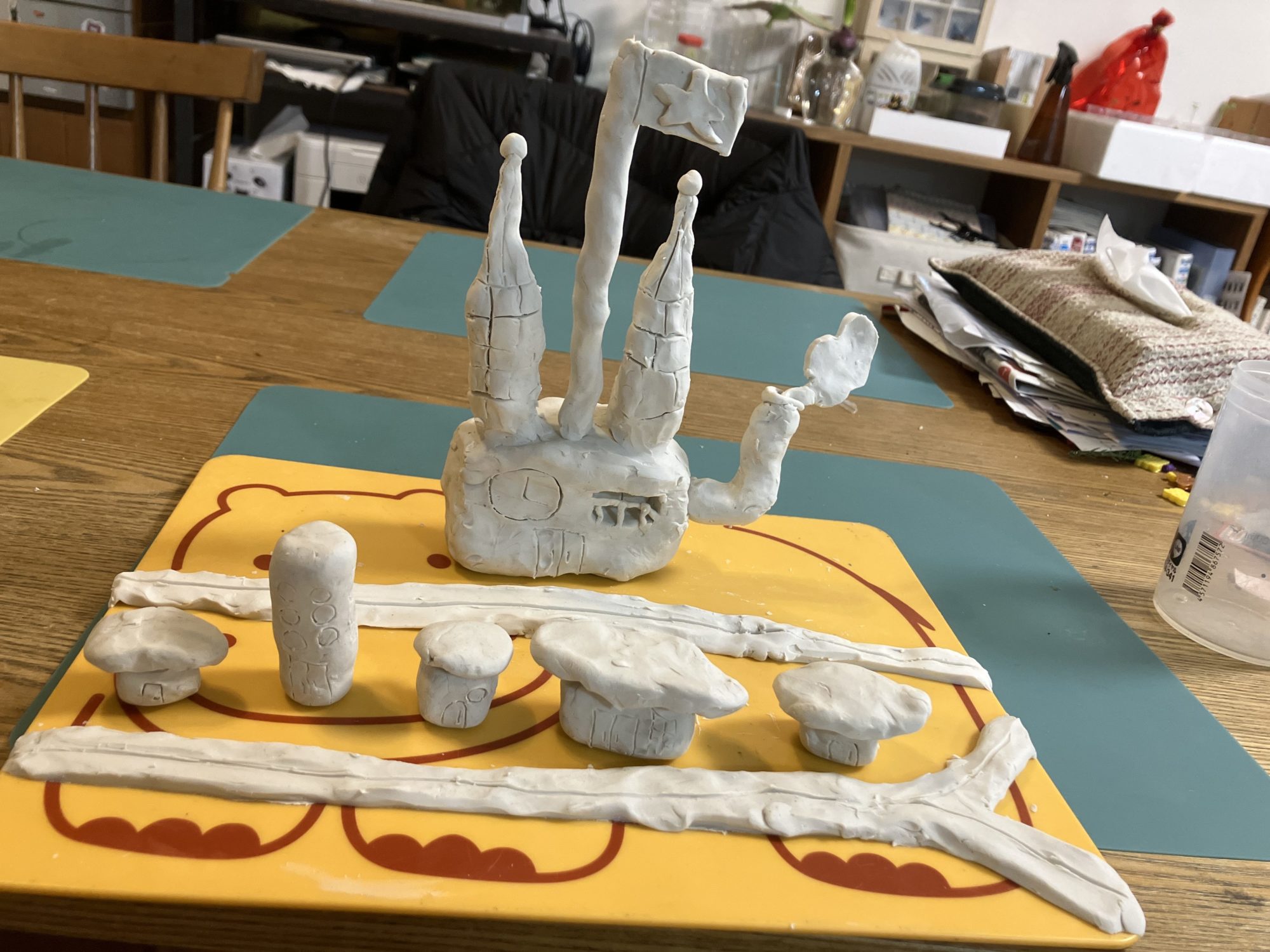 お城のバルコニーの部分を工夫しました。二本の塔、国旗、煙突、けむりの部分は安定させるため爪楊枝や竹串で柱を中に作りました。家は一つ一つ窓やドアを竹串で掘って、道路も滑らかな曲線になるようにしました。製作に一時間半かかりました。