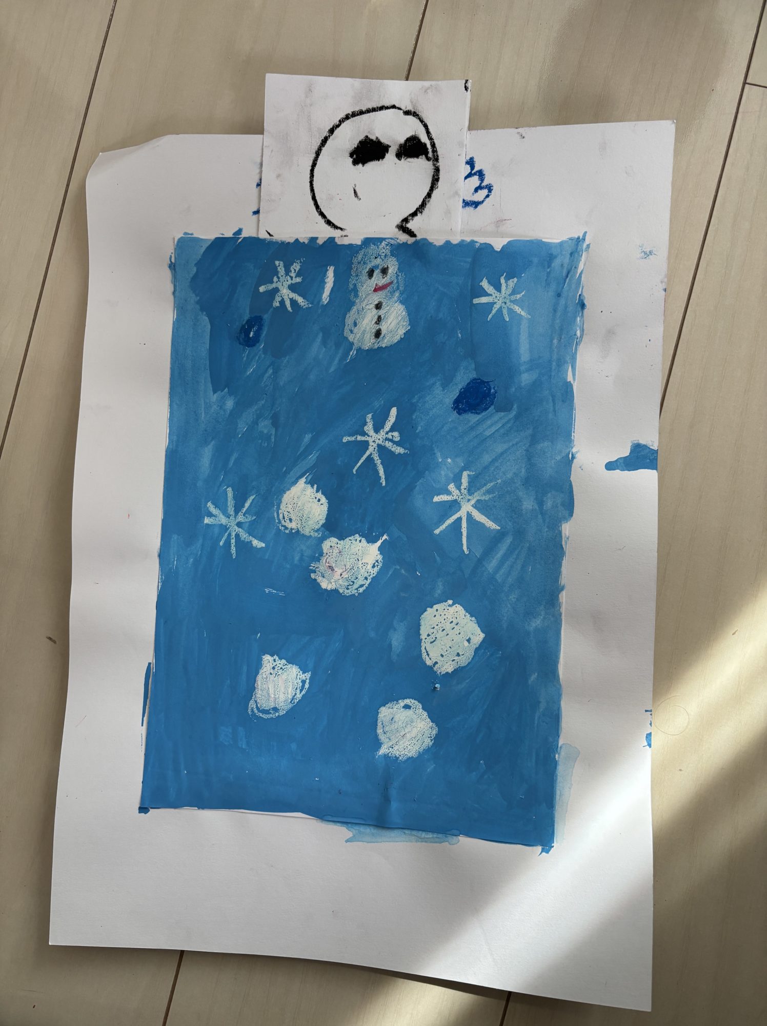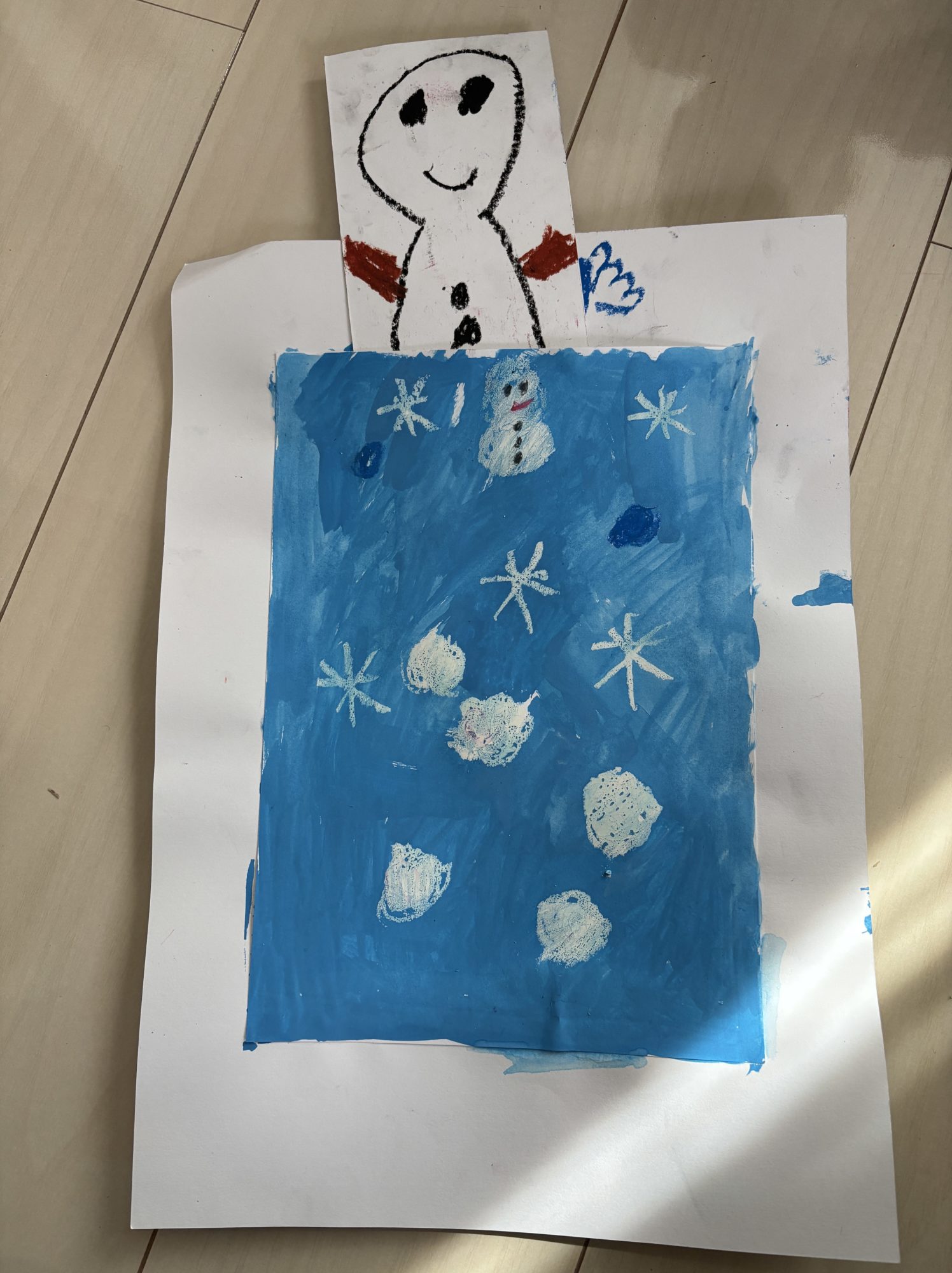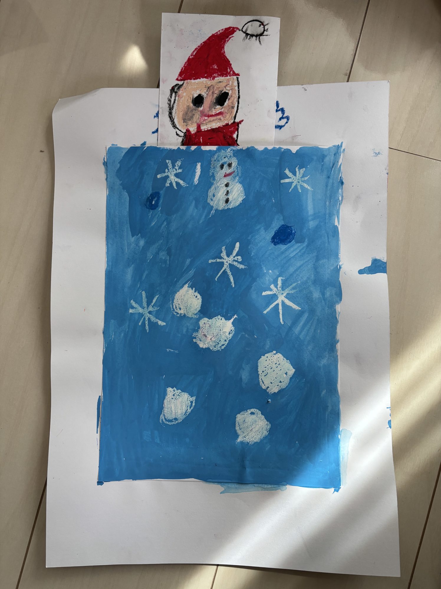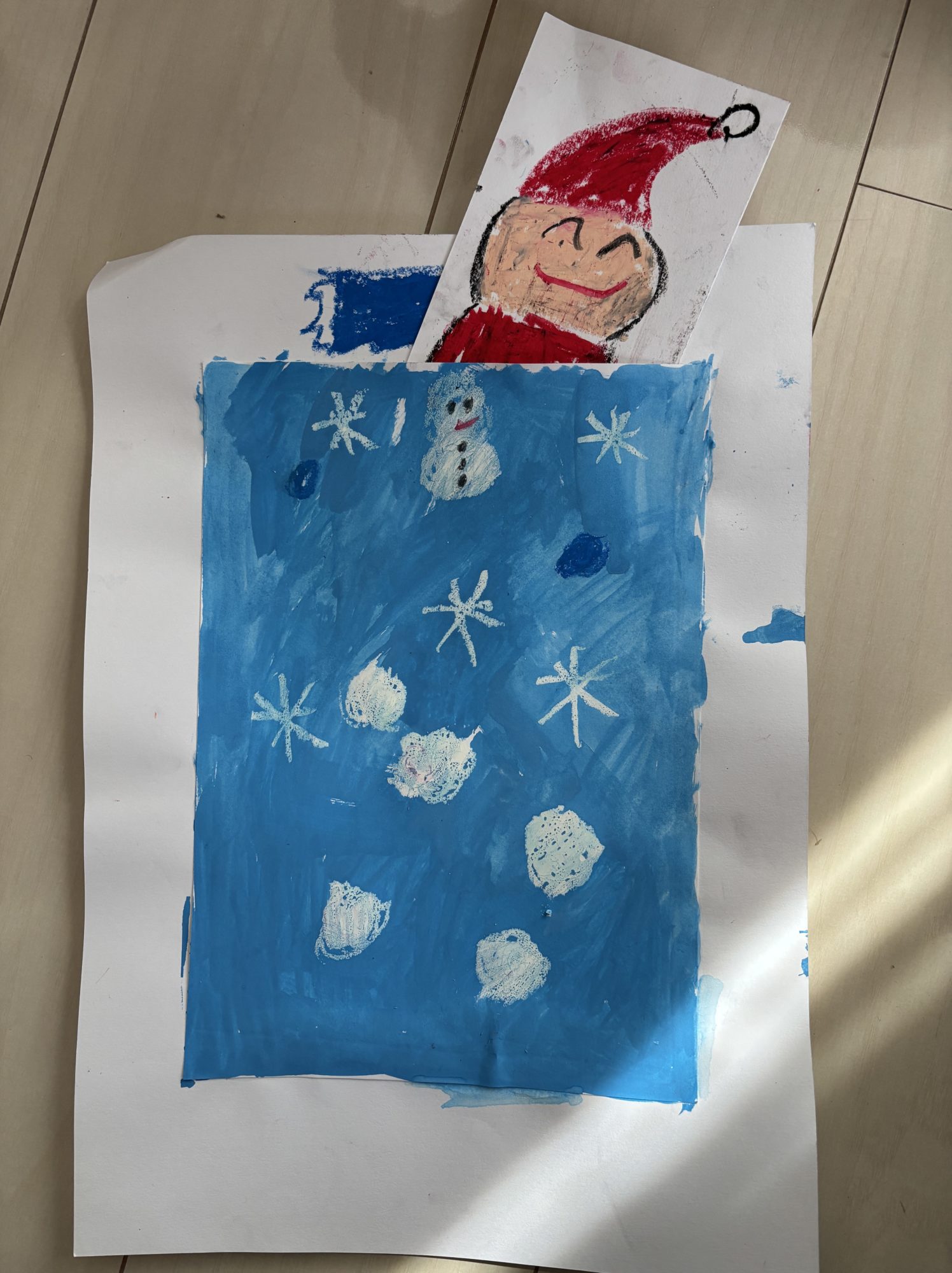 おふとんで寝ているサンタさんや雪だるまさんも、うらとおもてに描いたんだね✨ひょうじょうだけがちがうところが見てておもしろい!と思ったよ💤