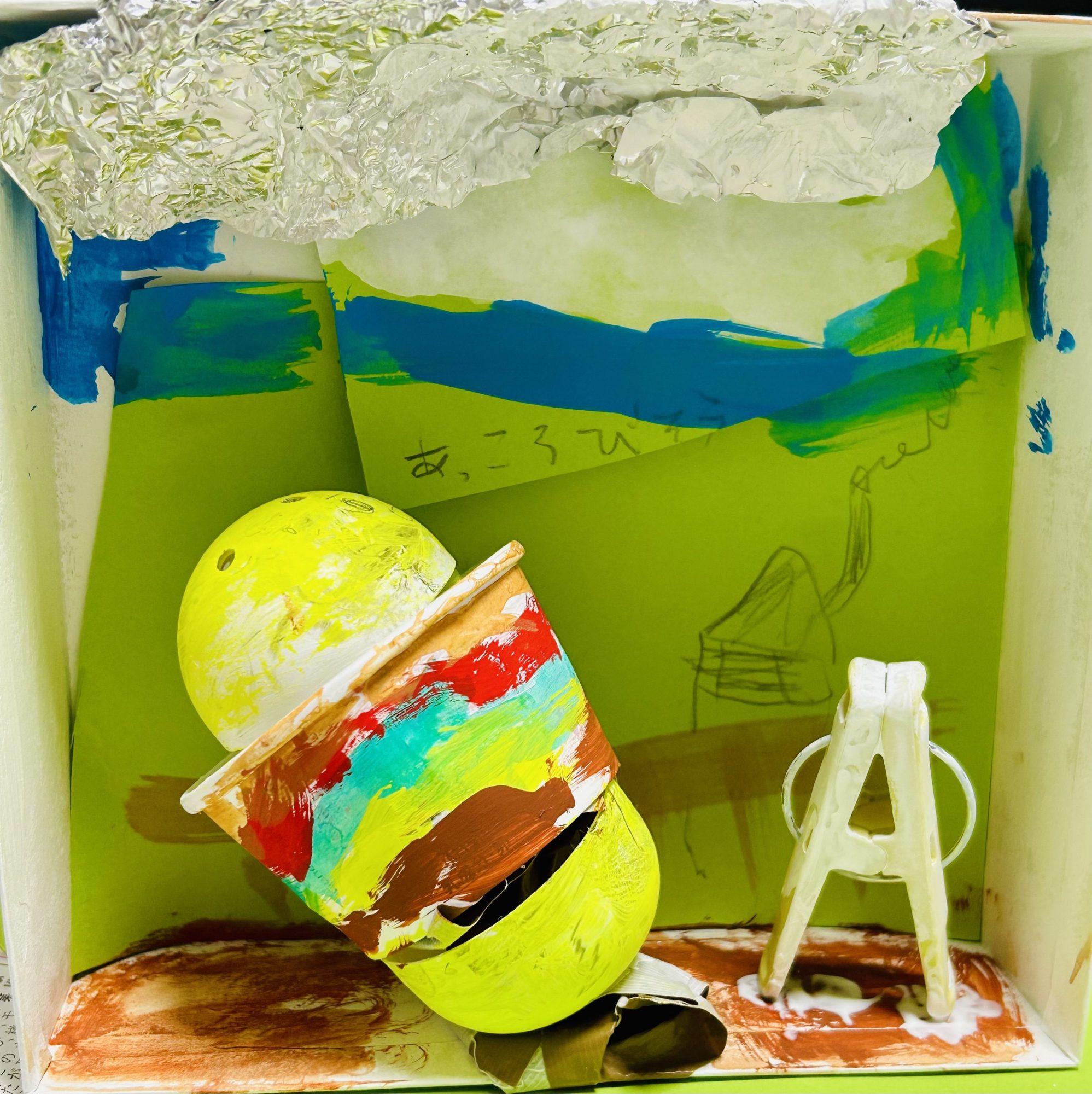 わかめせんせい 先生2026年3月1日 8:26 AM 箱の中に広がる、小さな舞台。 そこに「旅するハンバーガー」がちゃんと立っていますね。 あえてななめに置いたこと、いいね。 その傾きだけで、動きや時間が生まれています。 まっすぐではなく、ちょっと転がりそうな角度。 それが「旅」を感じさせる決定的な工夫になっています。 具材の色もとても自由。 レタスやトマトというより、景色そのものがはさまれているみたい。 ハンバーガーの中に世界が詰まっている感じがします。 屋根のアルミホイルの雲、奥の空のグラデーション、 空間全体が物語の背景になっていますね。 ダダイズムらしい「なんでこれがここにあるの?」という面白さもあって、 見ていると想像がどんどん広がります。 hirokiさん、このハンバーガーは、いまどこの国を旅しているところなのかな? ログインして返信する ↓