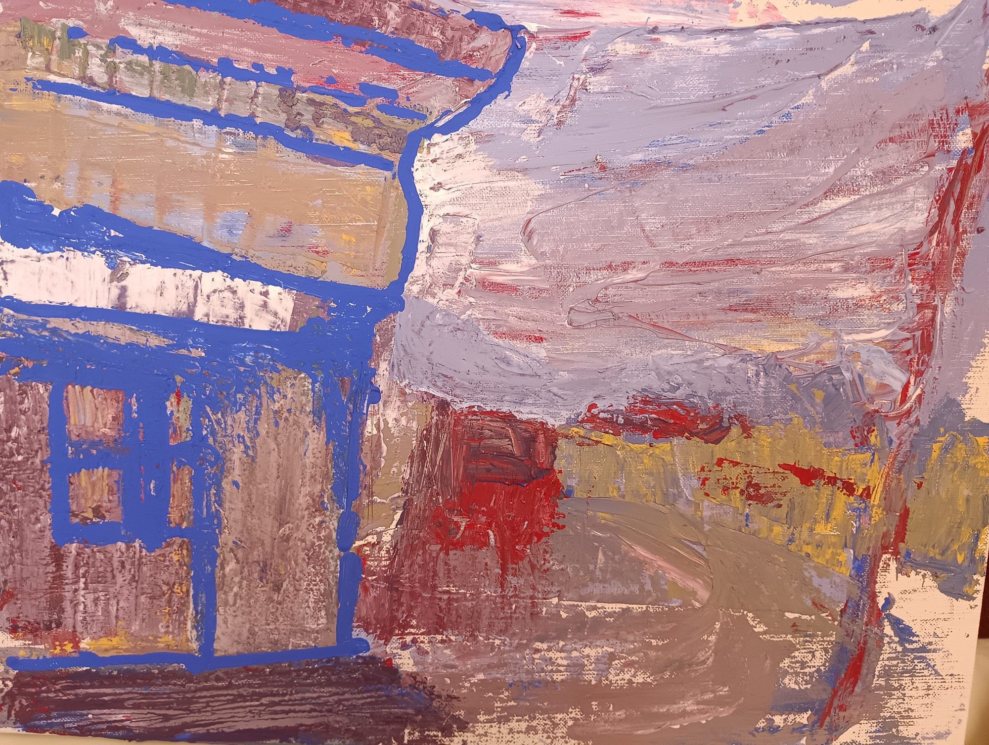 たこやきさん、作品を見てまず目に入ってきたのは、太い青い線で描かれた建物の形です。窓の四角や屋根の線がぐっと力強く、町の骨組みをつかまえているようでいいね。そこに赤や茶色、灰色の絵の具が重なって、道や空気の流れまで動いているみたいに感じました。右へ曲がっていく道も印象的で、「この先にどんな景色があるのかな」と想像が広がります。🎨