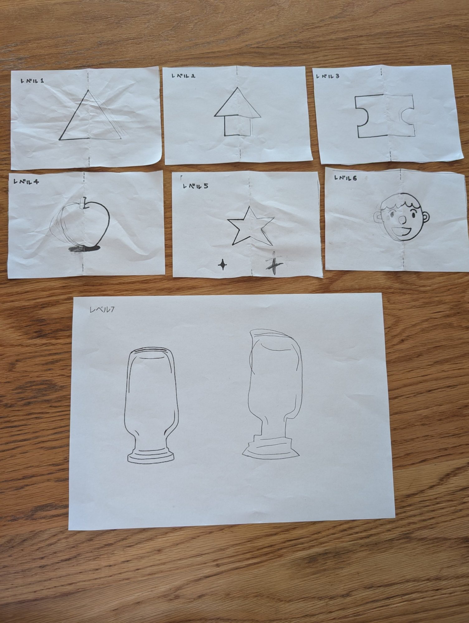 もっちゃんさん、レベル1から7まで、形が少しずつむずかしくなっていく中で、線をよく見て、ぴったり重ねようとしている気持ちが画面いっぱいに伝わってきました。△や星、りんご、お顔、そして最後のかたちまで、それぞれに「ここを合わせたい」という集中のあとがあっていいね✨👏😊