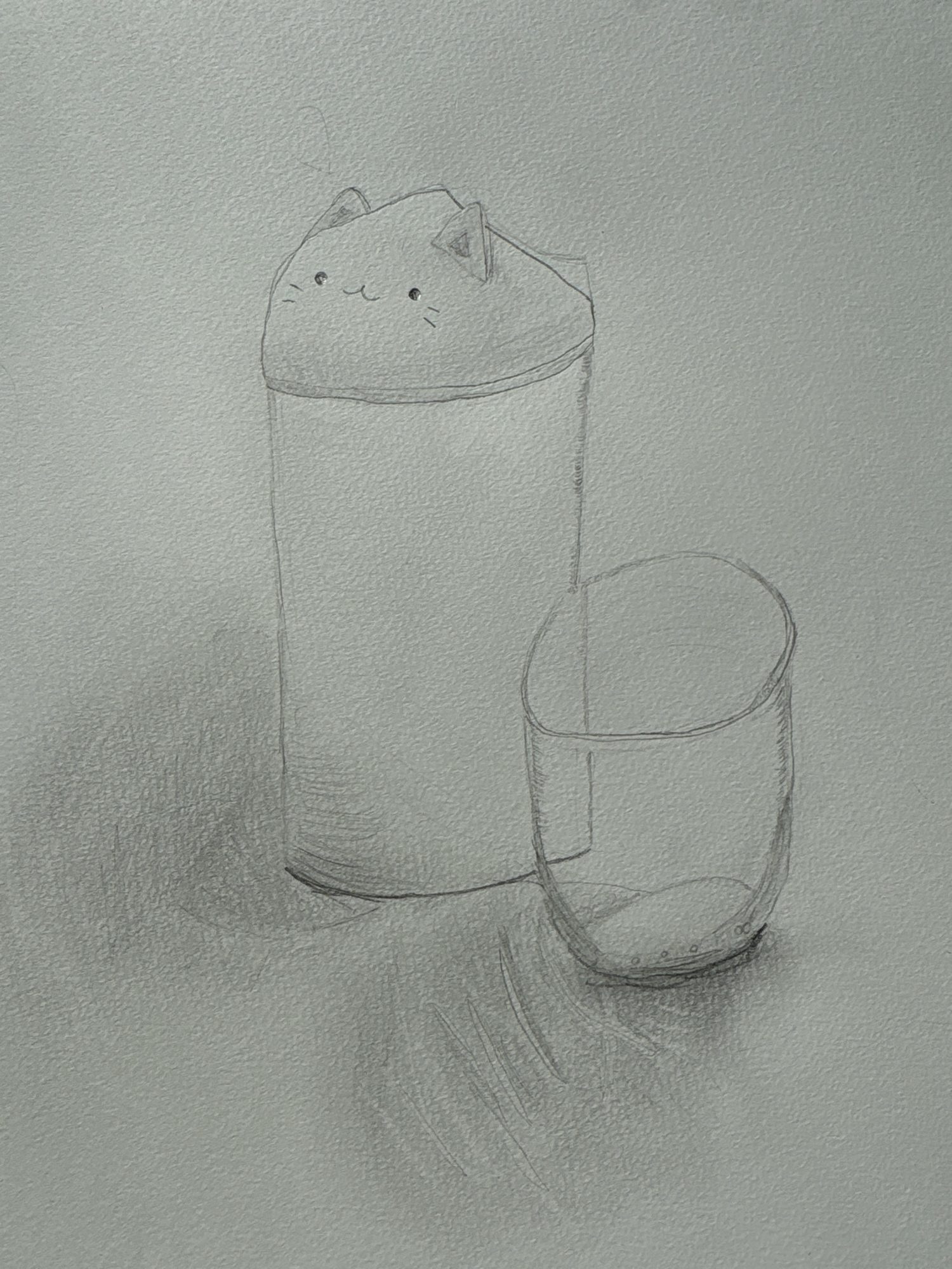 猫のゴミ箱の丸みと、コップの透明感がやわらかい線で丁寧に描かれていて、見ていてほっとする空気がありますね。特にコップの縁の楕円や、底にたまる影の濃淡がとても繊細でいいね!ガラス越しに見える奥の形や、少しずれた反射の表現から、じっくり観察している様子が伝わってきます。