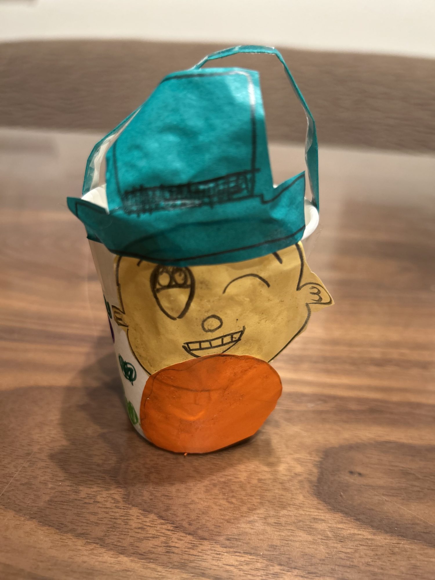 紙コップの丸い形に、ウインクした顔とオレンジの金貨のふくらみが重なって、小さな妖精がほんとうにそこにいるみたいです✨🍀