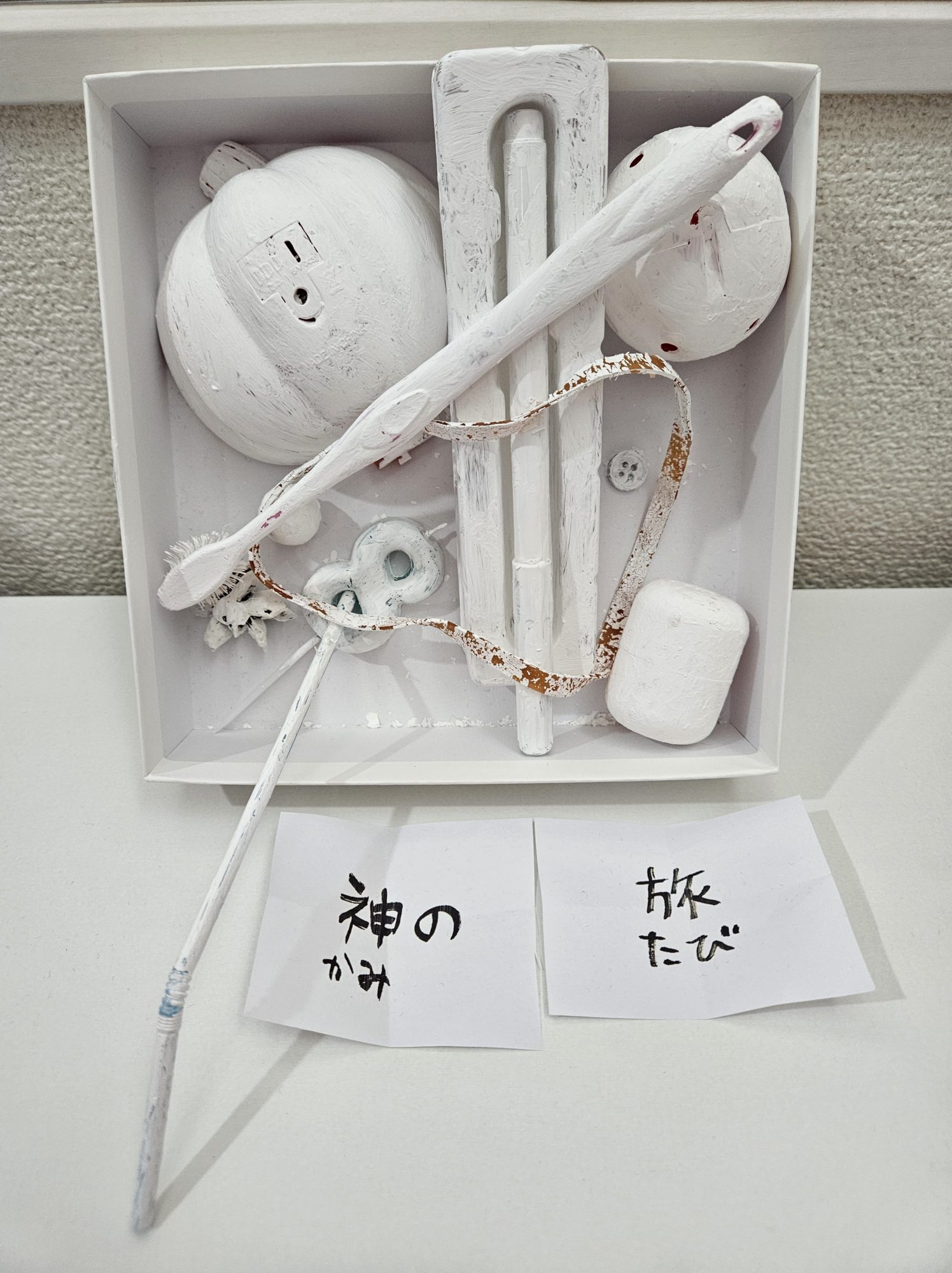 デッサンやキャラクターの絵を積み重ねてきたyumekoさんが、今回はくじ引きで決めた「神の旅」というテーマに、ものを集めて白く塗るという全く違う表現で向き合っていて、新しい挑戦を楽しんでいるのが伝わってきます。
