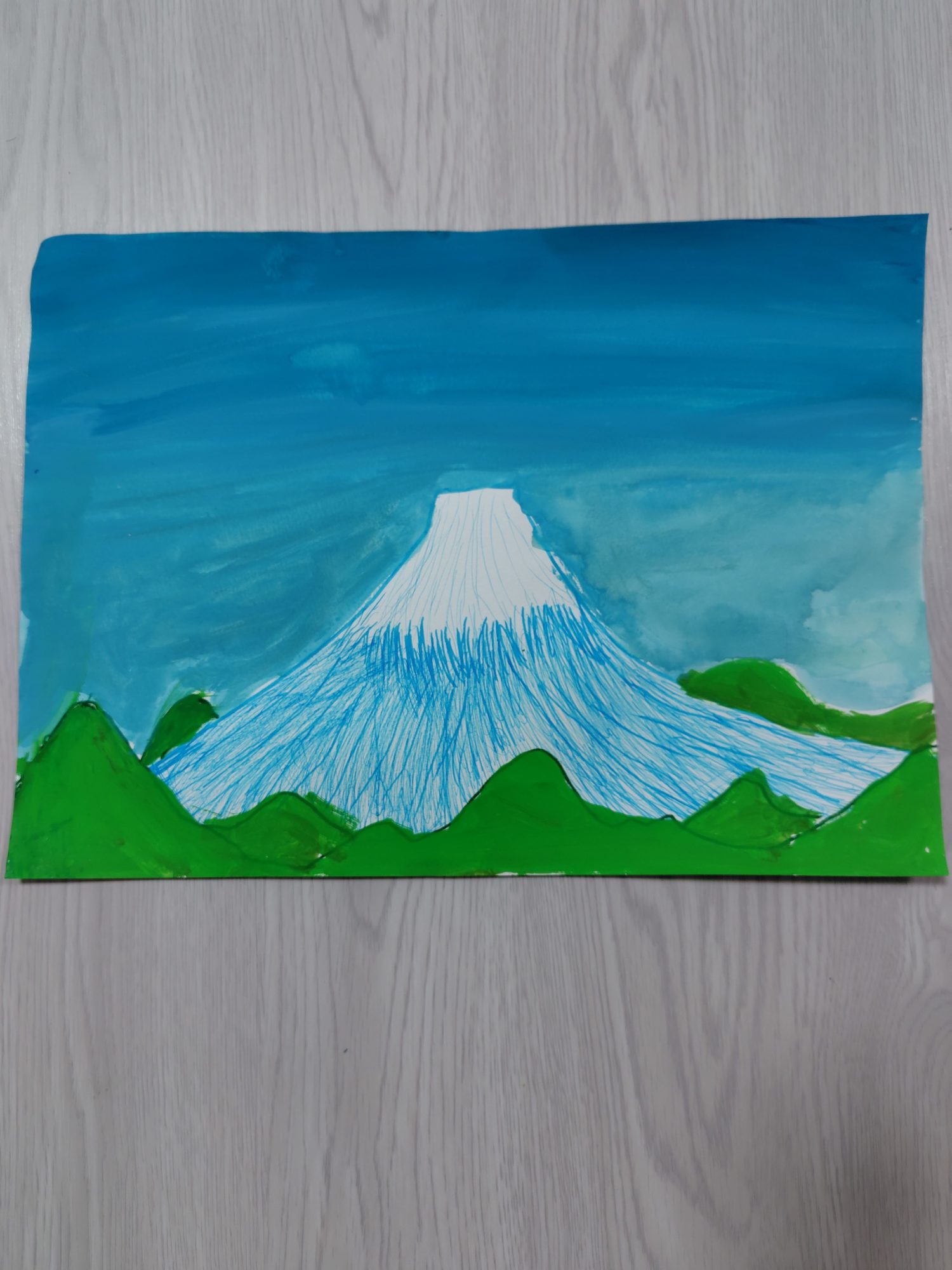 そして富士山の方は、まったく違う魅力がありますね。大きくどんと構えた形と、下の緑の山との対比で、「圧倒的な大きさ」をしっかり見せているのがいいなと思いました。青い線で描いた斜面も、山の広がりや高さを感じさせてくれます🗻