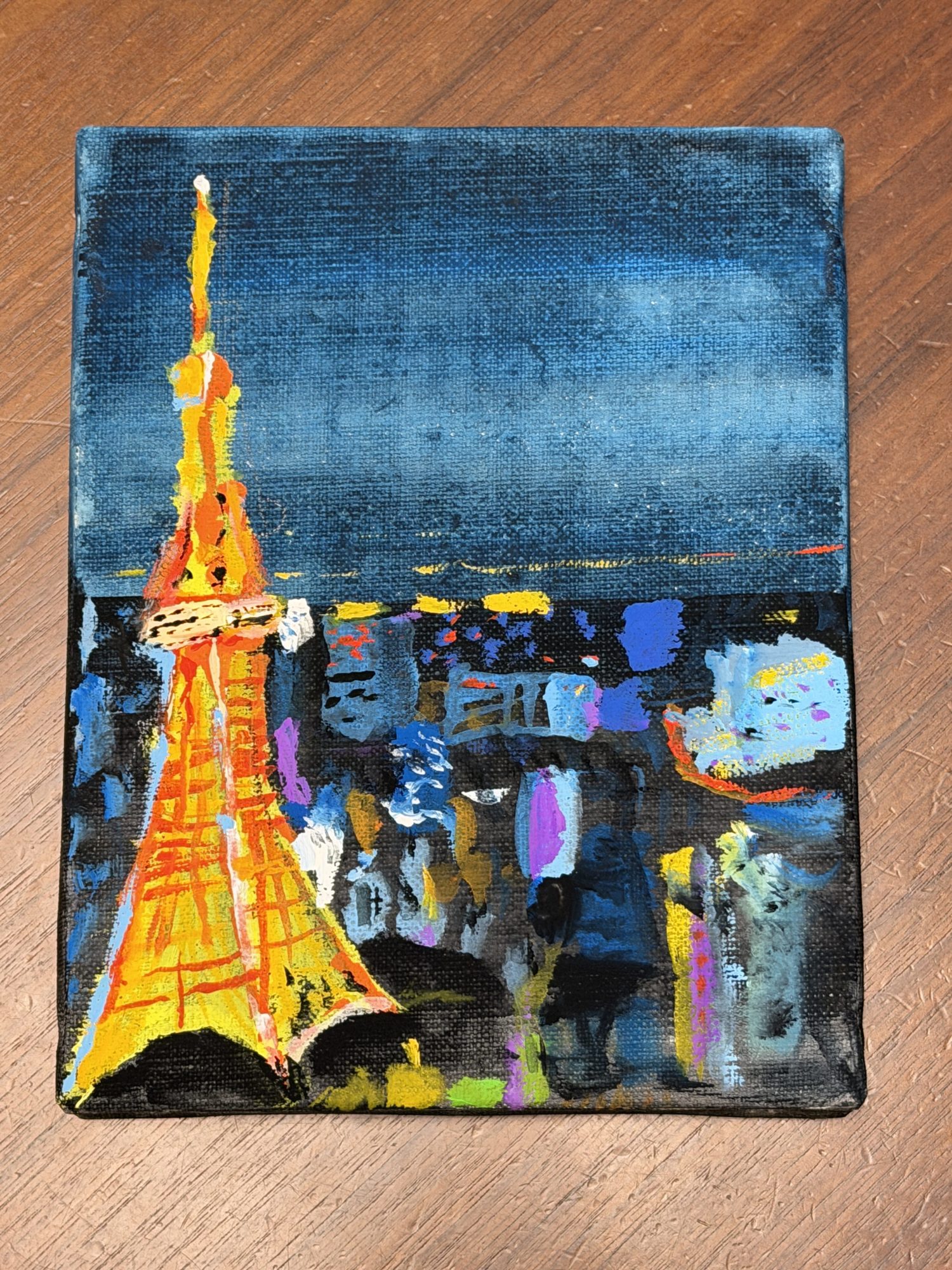 わかめせんせい 先生2026年3月25日 11:23 AM もんさん、夜の深い青の中に、東京タワーのあたたかいオレンジがすっと立ち上がっていて、とても印象的です。 タワーの細い線や、にじむような光の広がりが、夜の空気まで感じさせてくれていいね!🌙✨ 街の部分は、いろいろな色が重なり合っていて、にぎやかさや光のゆらぎが伝わってきます。難しさの中でたくさん試した跡が見えていいね。 光と暗さのバランスを自分なりに探している、その挑戦がしっかり絵に残っています。 私は、この絵から「静かな夜とにぎやかな街が一緒にいる時間」を感じました。🌃 この東京タワーのまわりには、どんな人たちがいると思いますか?😊 ログインして返信する ↓