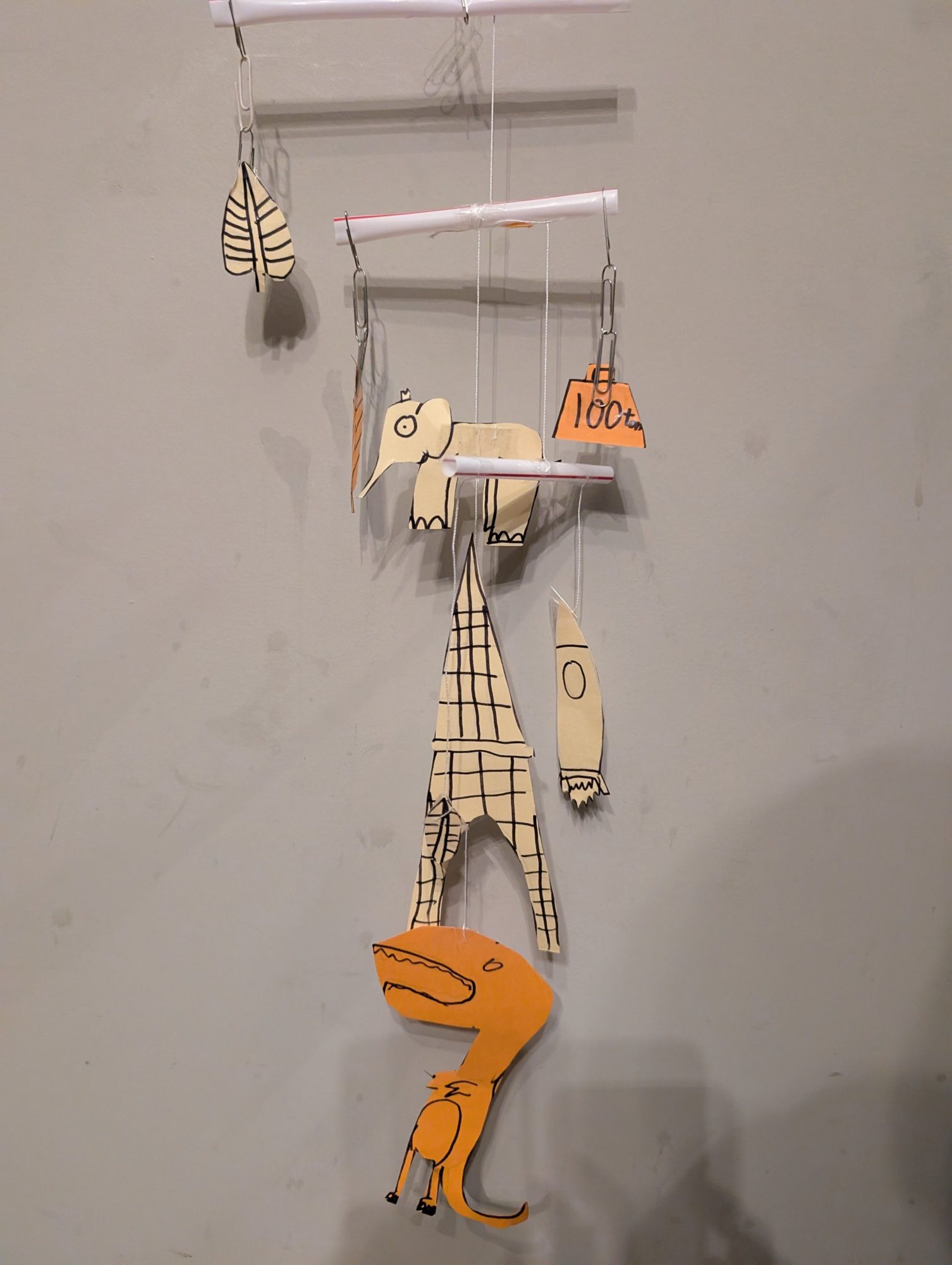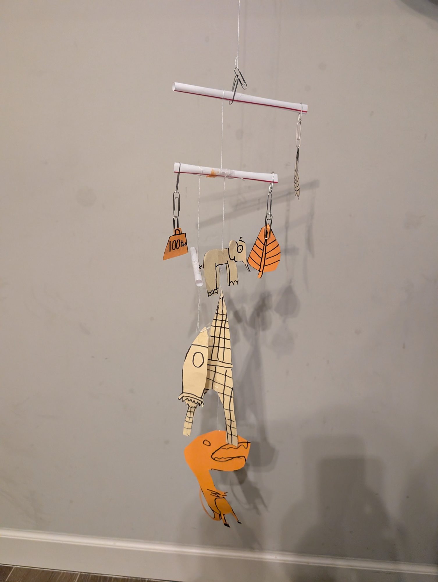 紙のストローやクリップでつながれたモビールが、ゆらゆら揺れながらバランスをとっているね。