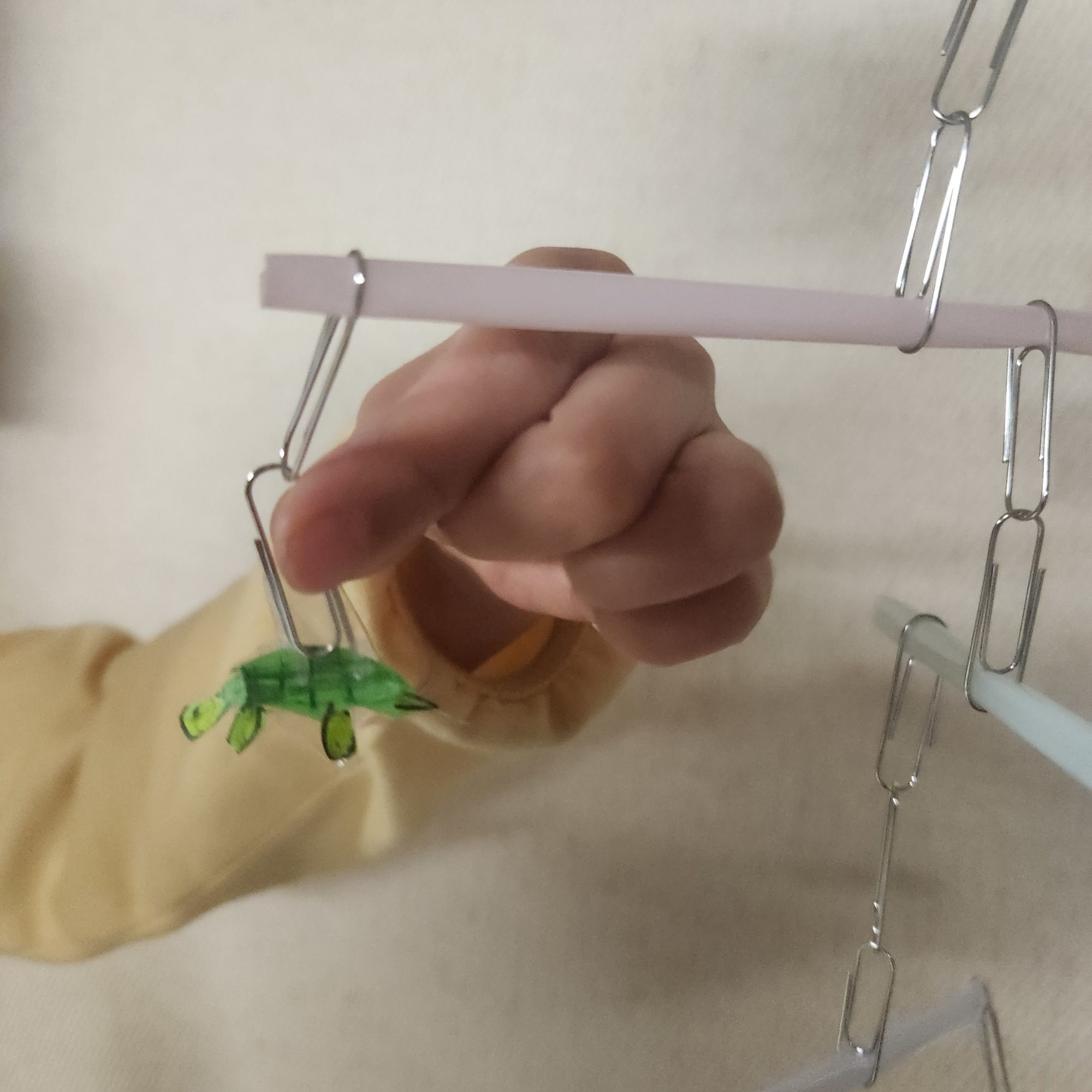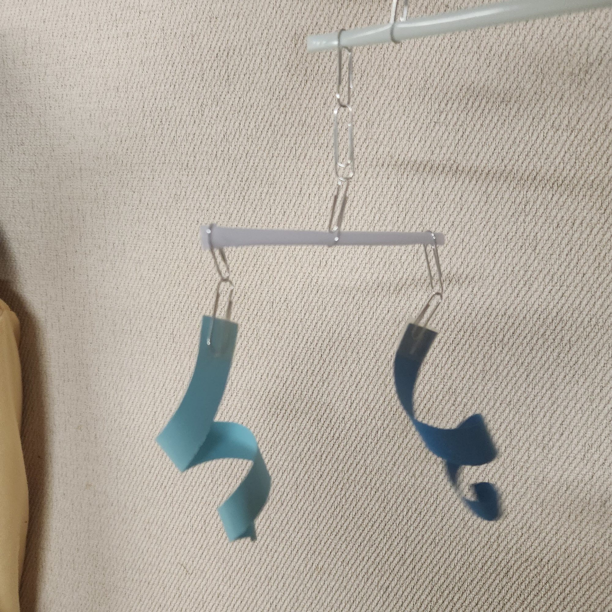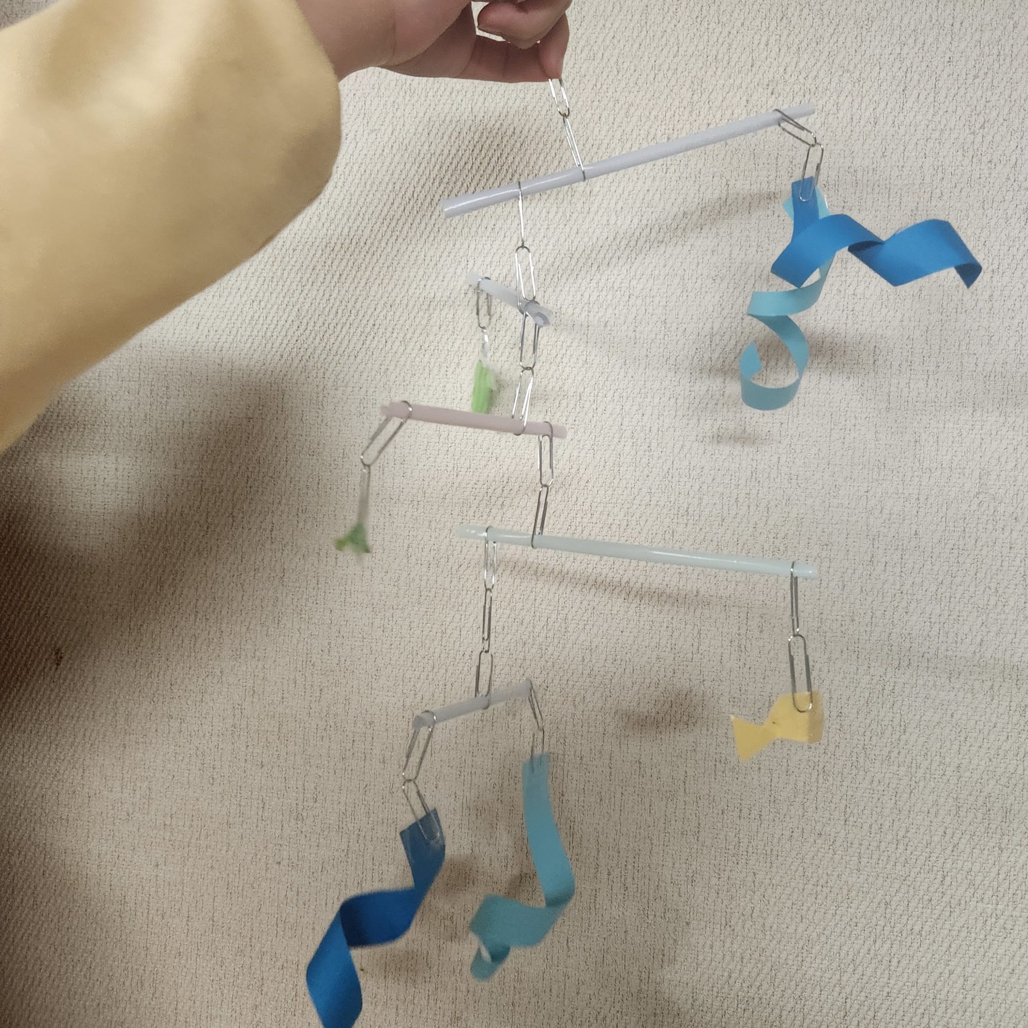 青の色のちがいも気持ちよくて、ゆらゆらと波が重なっていく様子が目に浮かびます。紙の軽さとクリップの重さ、そのバランスがとてもおもしろくていいね!🌊