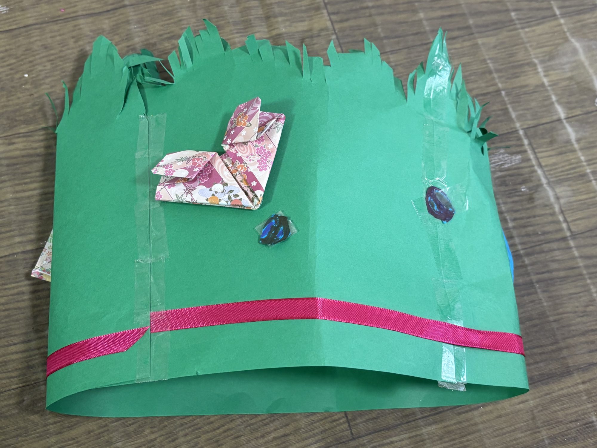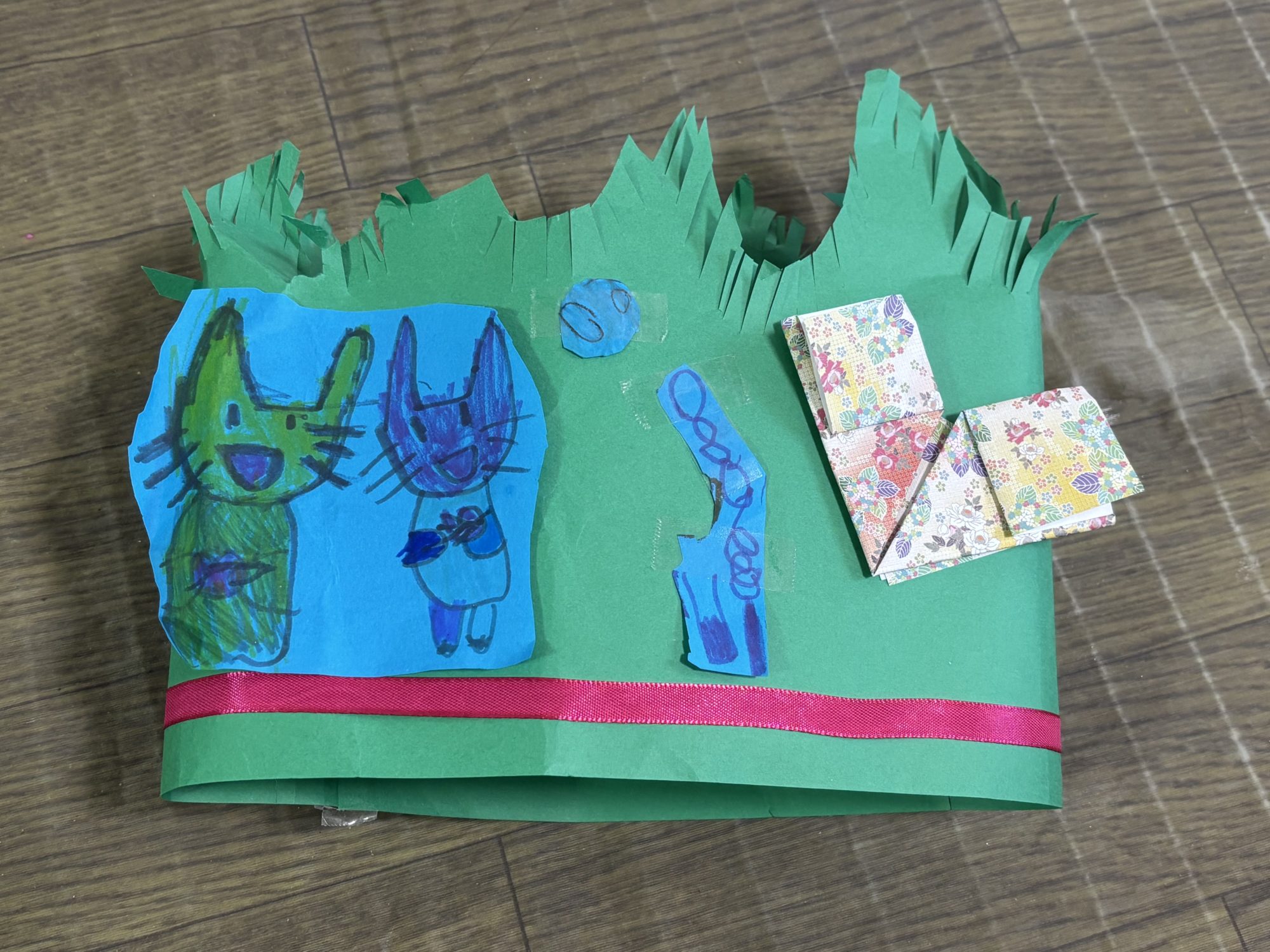 草のかんむりに、細かく切り込みを入れてつくったふさふさの形が、本当に草が風にゆれているみたいでいいね🌿
