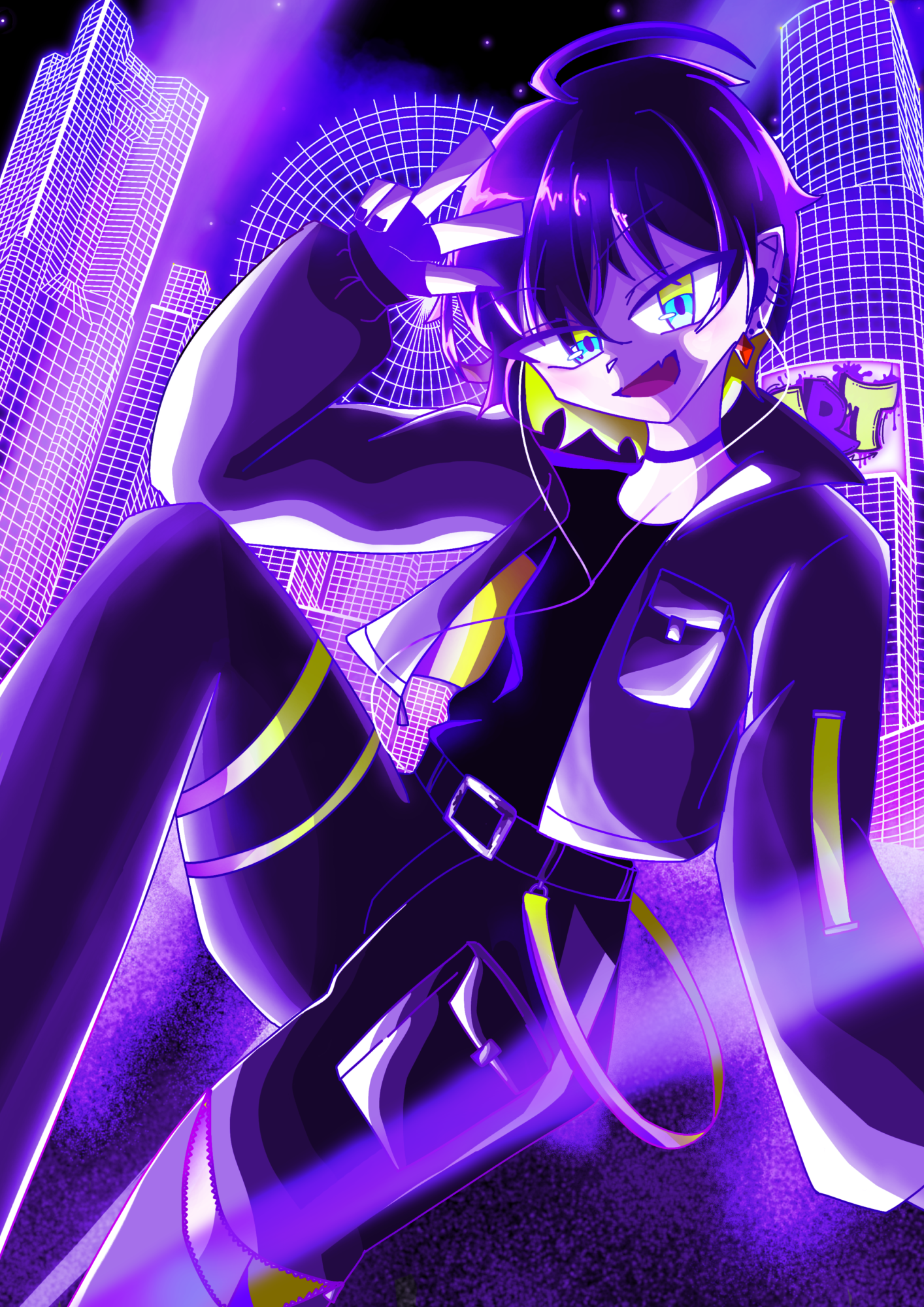 紫の世界の中に、黄色や水色がピリッと効いていて、リズムのある色の配置になっているのも印象的です。背景のグリッドやビルの線と、人物のやわらかい面の対比も、空間の広がりを感じさせてくれます🎧