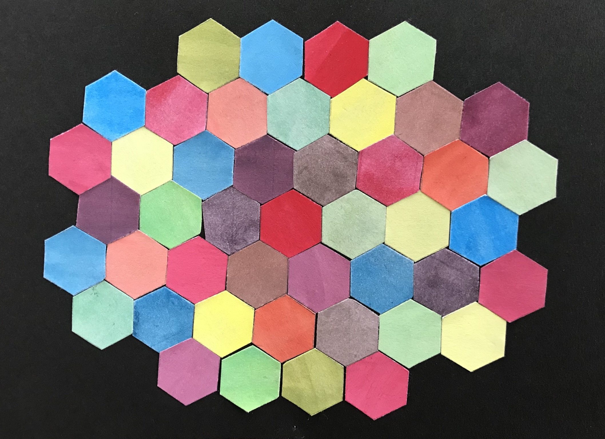 ポスターカラーで色を塗って、同じ大きさの六角形に切り取って貼りました。